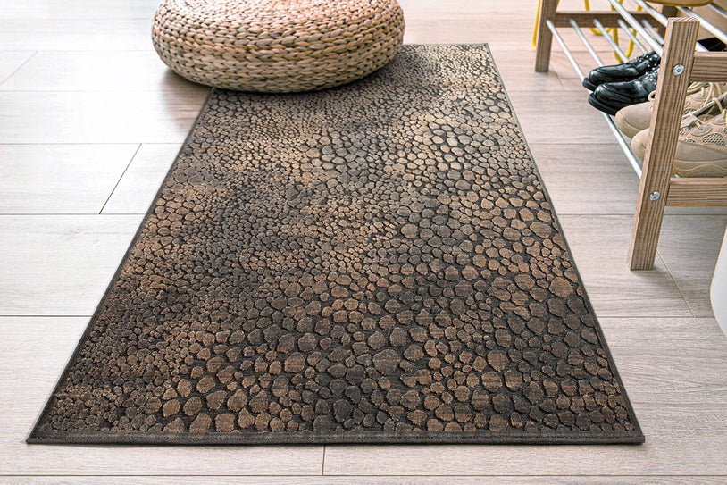 The surface feels smooth underfoot and carries a mottled texture that hints at artisanal elegance. Its latex backing keeps it perfectly in place, while floor-heating compatibility ensures cozy warmth throughout the seasons. Whether styled beneath a leather sofa or complementing oak cabinetry, this rug creates a dramatic foundation without overwhelming the senses.