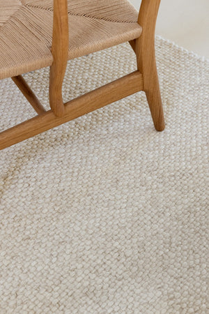 Handwoven with a high-quality blend of natural fibers — primarily wool and cotton — it delivers a soft yet durable surface that suits contemporary and Scandinavian interiors alike. Its warm white color brings a bright, airy feel to any space, making it a versatile choice for living rooms, bedrooms, or offices.