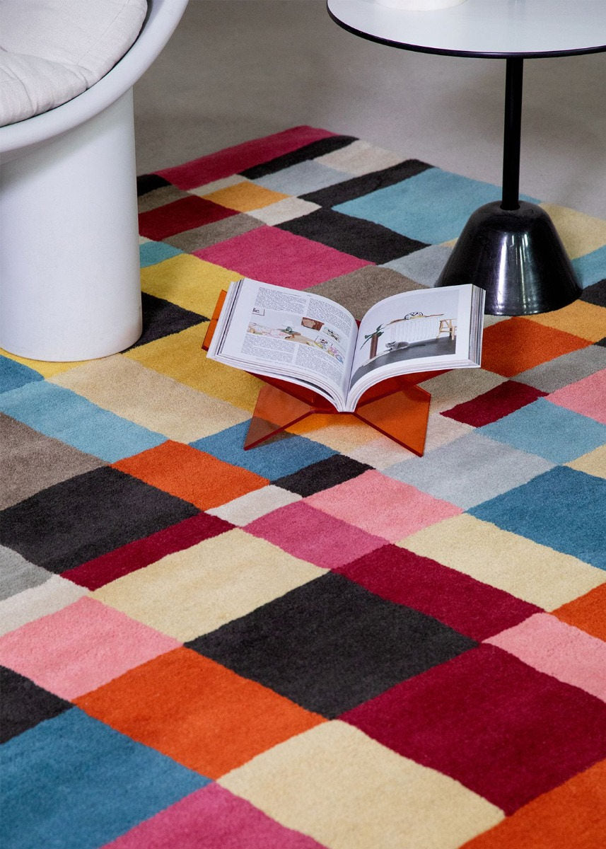 Let the Domino rug shine by pairing it with minimalist furniture in neutral tones, allowing its bold colors to pop. Introduce solid cushions or throws that echo one of the rug’s vibrant hues to create a cohesive, energetic look without overwhelming your space.