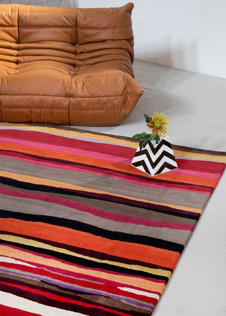 The Brink & Campman Estella Summer 85200 is a vibrant hand-tufted wool rug that brings the warmth and energy of summer into your home. Crafted in India, this rug features bold, irregular stripes in hues of orange, red, taupe, black, fuchsia pink, and lilac, creating a dynamic and contemporary look.
