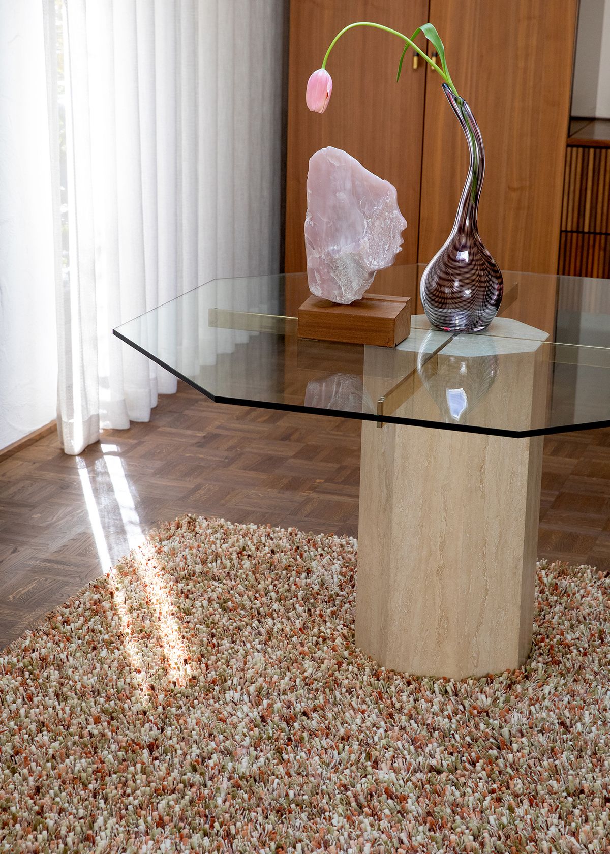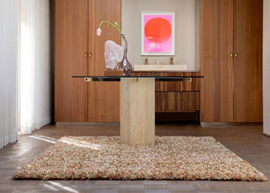Balance the vibrant pattern with neutral furniture and simple décor to let the rug take center stage. Add vintage accessories or plants to complete the seventies-inspired look.