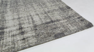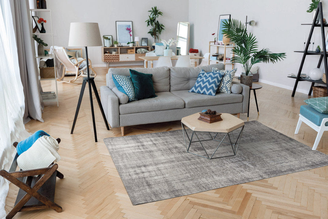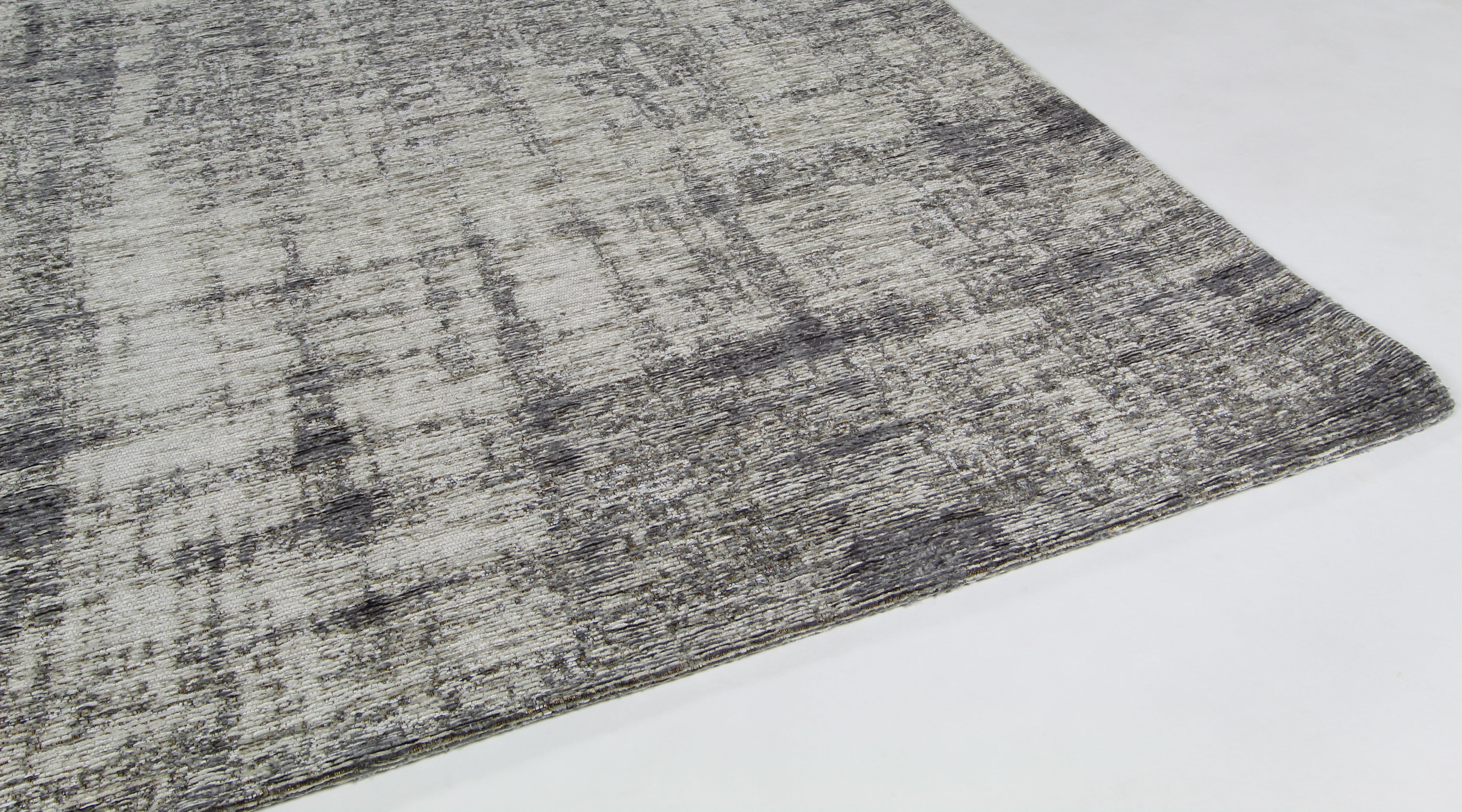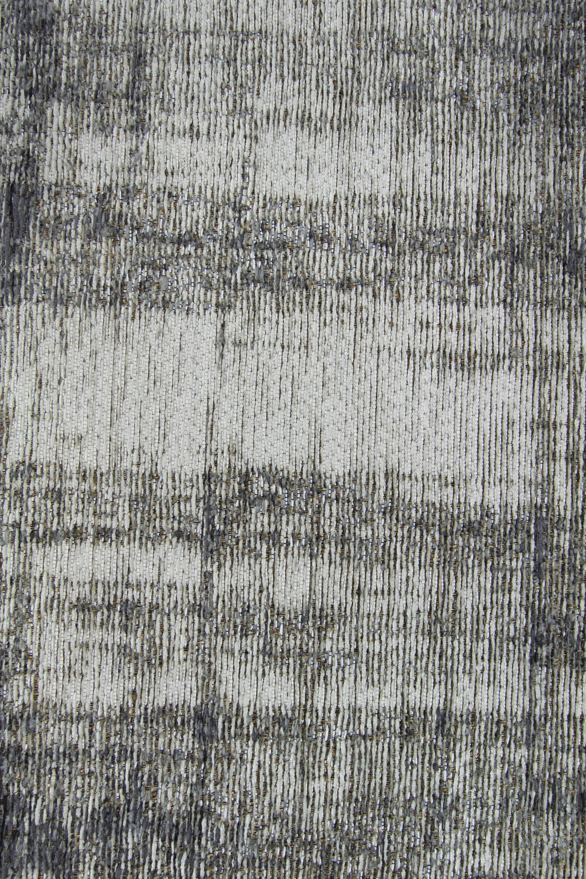 Its gently distressed surface carries soft metallic threads woven into a mélange of taupe, grey, and silver—echoing the patina of softly weathered metal. Despite its character, the pile remains firmly low at approximately 3.5 mm, making it ideal for positioning under furniture, in hallways, or in living zones without disrupting flow.