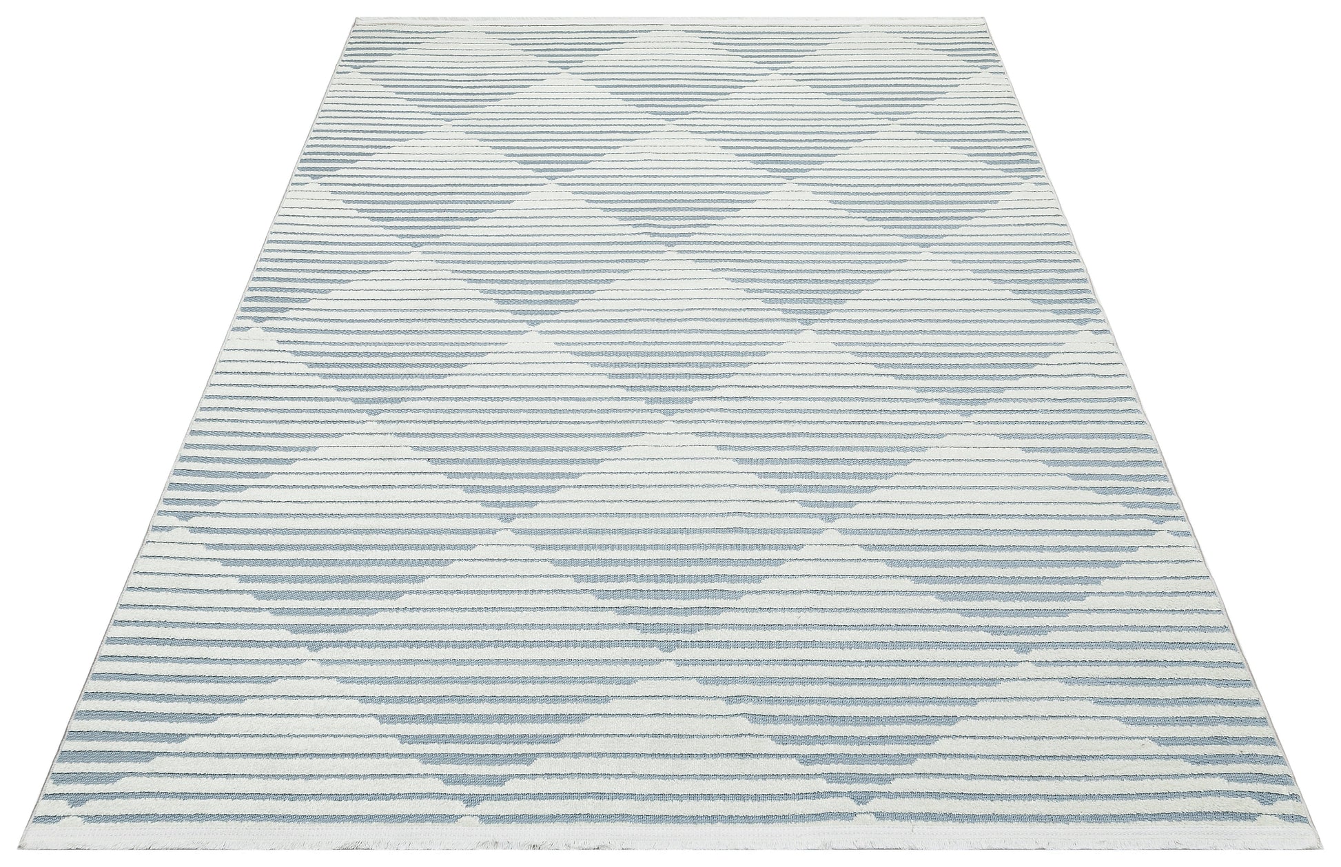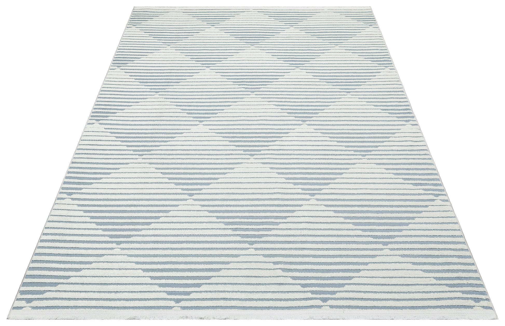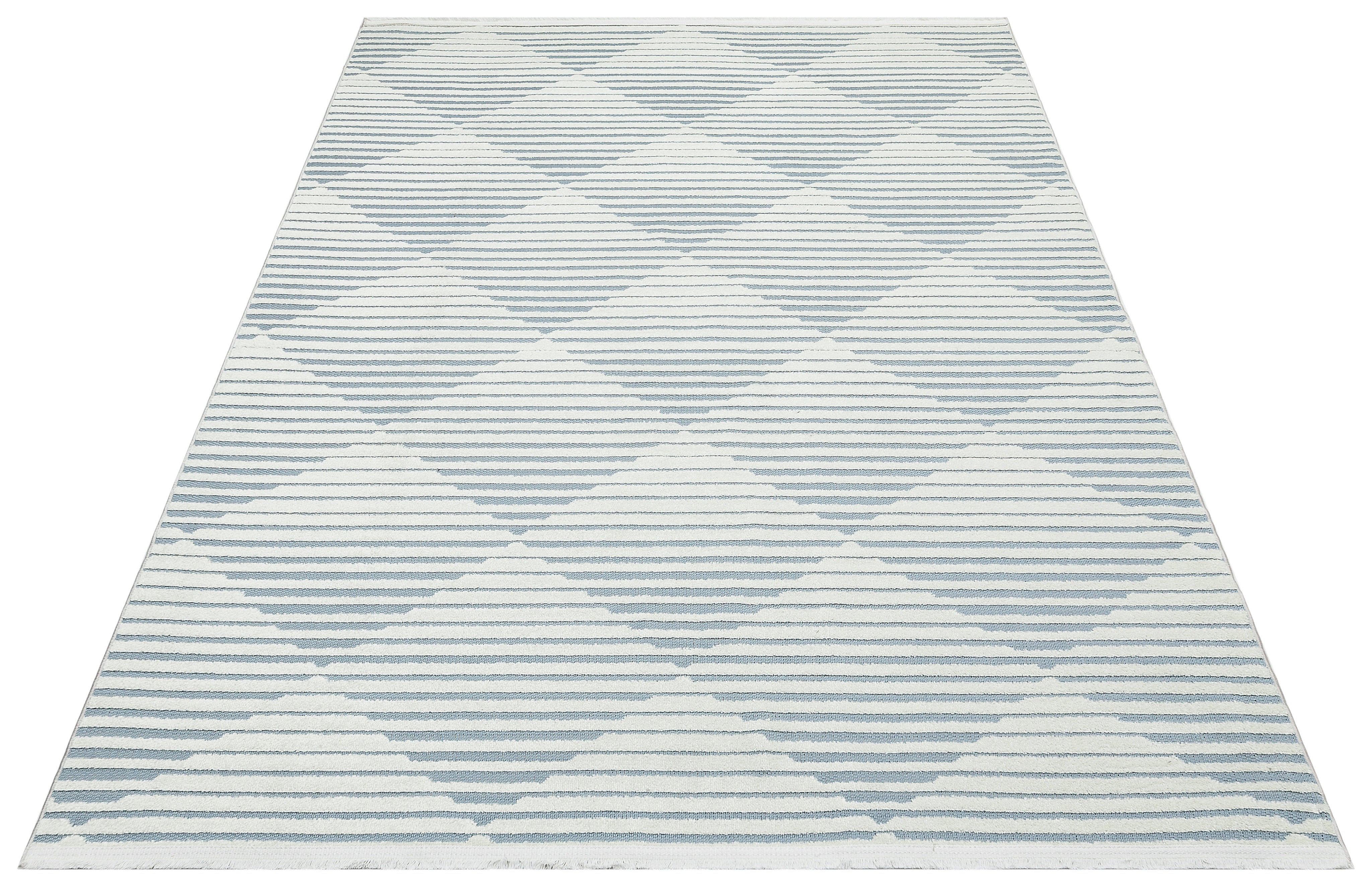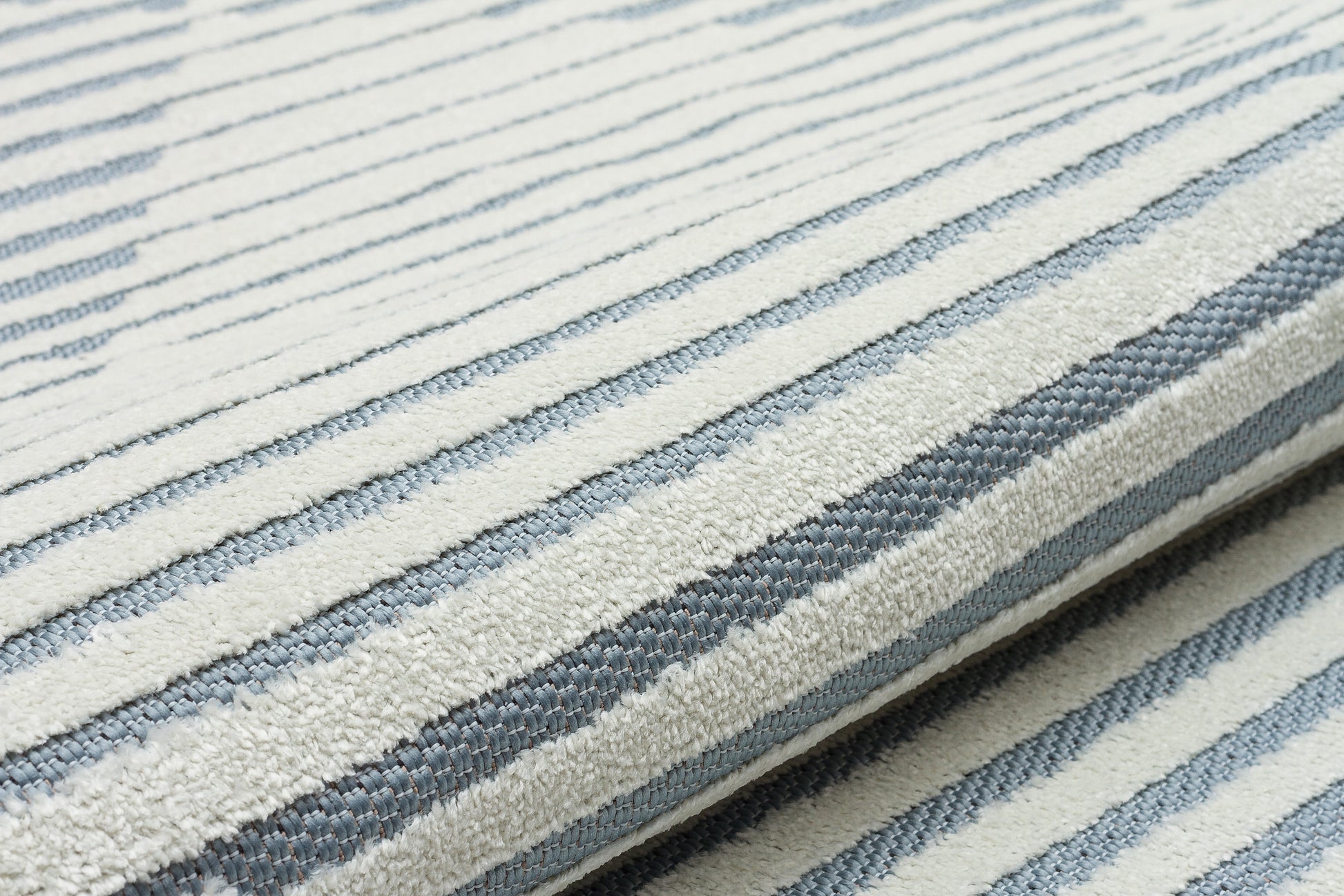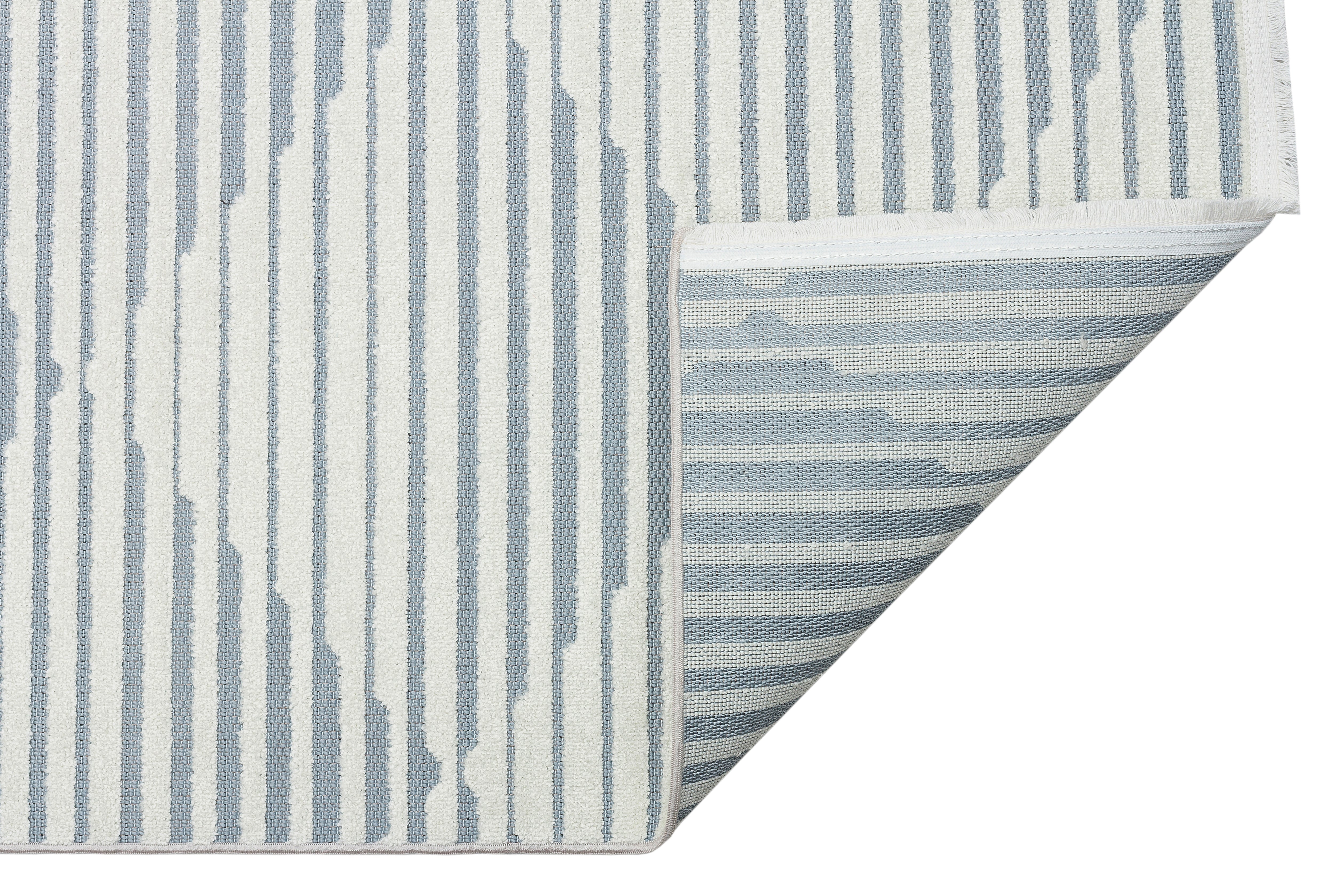 The palette blends cool blue with earthy neutrals, making it easy to pair with natural wood, ceramic accents or linen upholstery. Whether your style is coastal, Scandinavian or urban minimal, this rug slips in effortlessly.