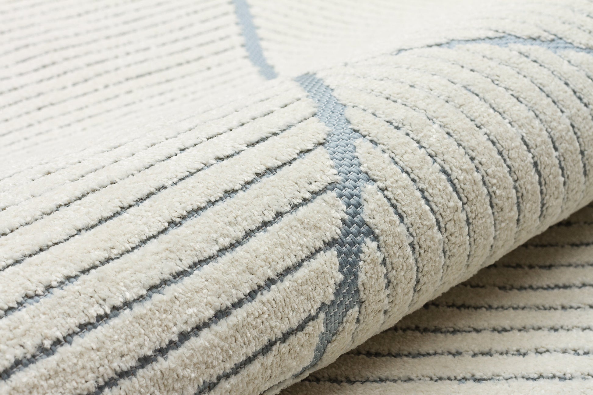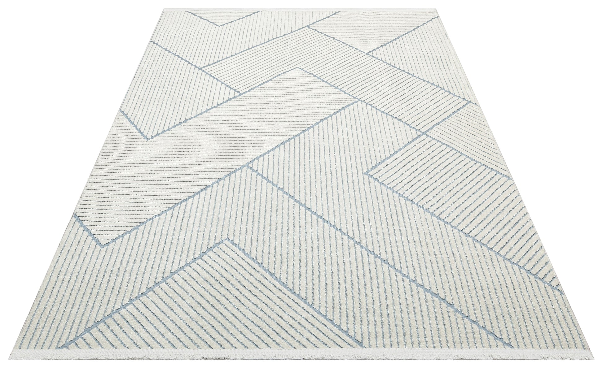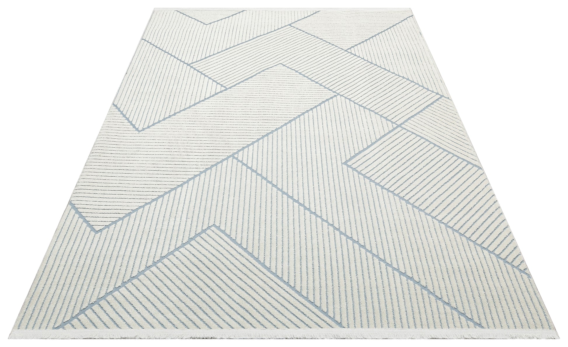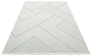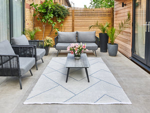 The Jazz Blue JAZ13 rug by Concept Looms offers an easygoing rhythm of colour and form. Its design combines horizontal bands in denim blue, off-white and grey-beige — evoking a relaxed, coastal feel that works beautifully in both indoor and outdoor spaces.