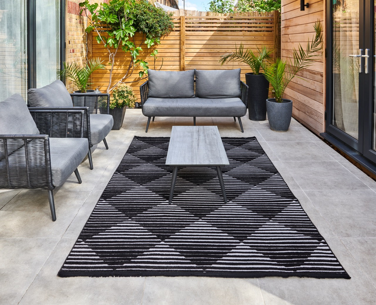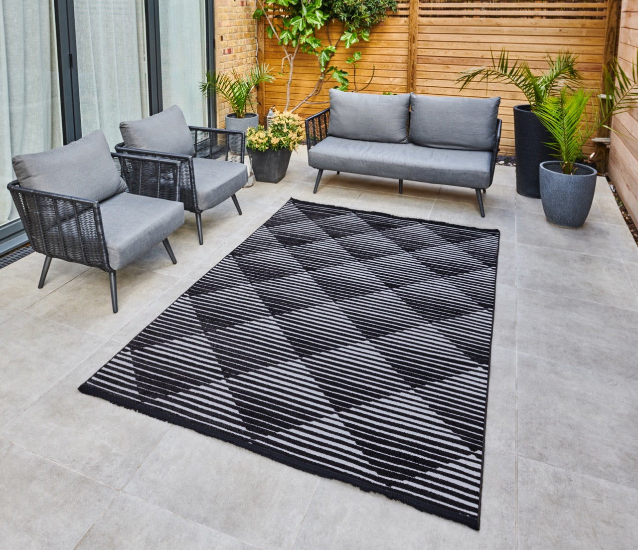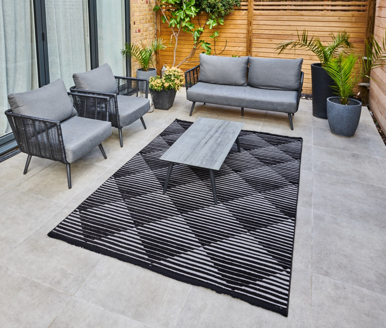 The bold grey palette is softened by natural undertones, creating a balanced look that complements wood, metal, or stone finishes. Whether styled under black-framed furniture or layered into a modern patio, the JAZ09 adds quiet confidence.