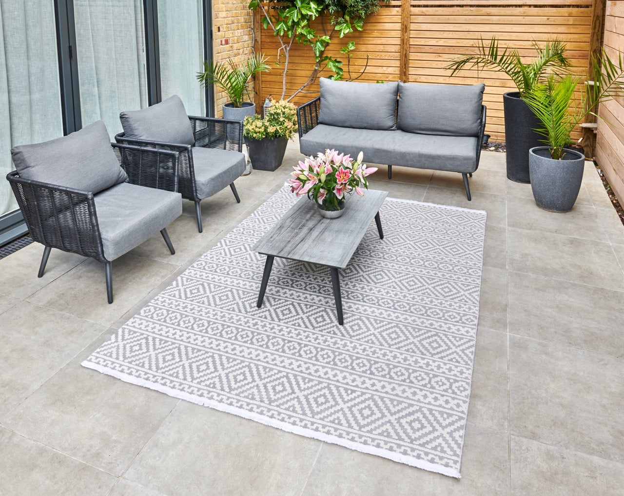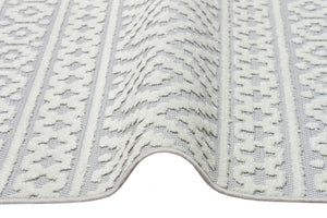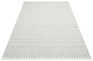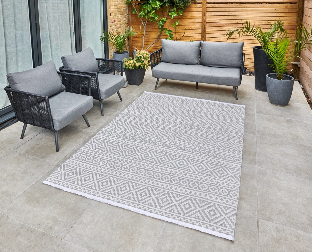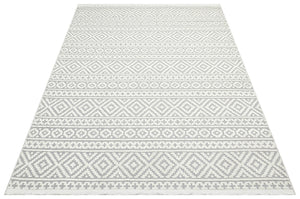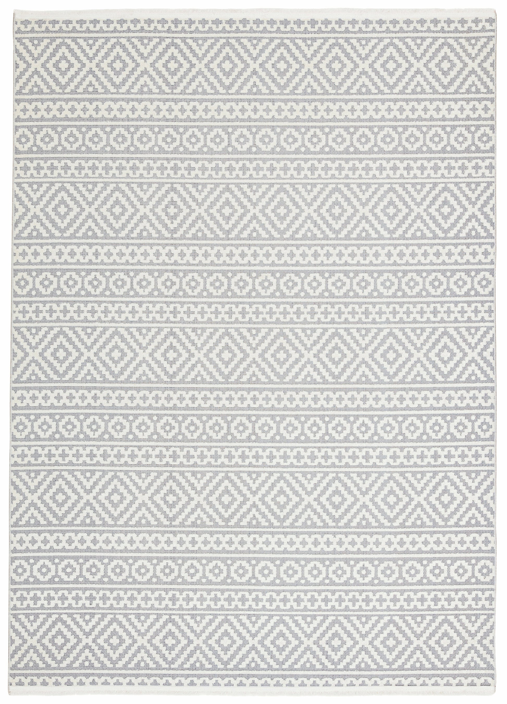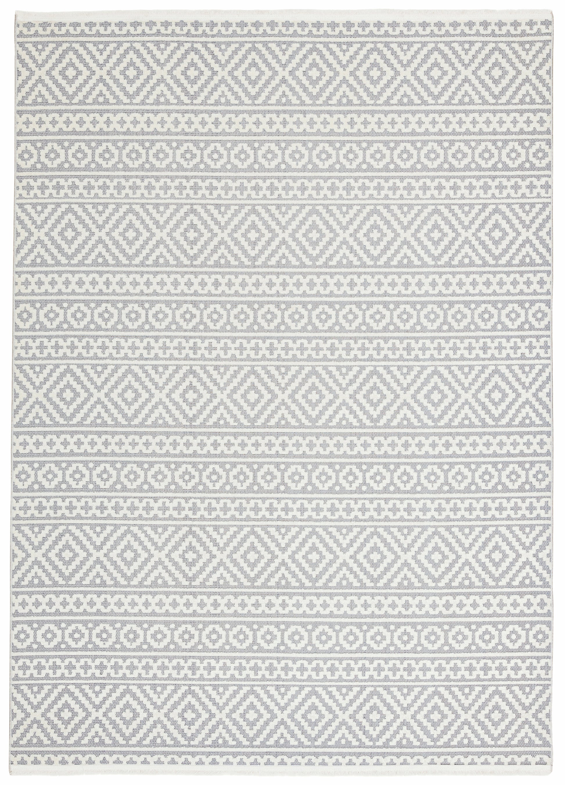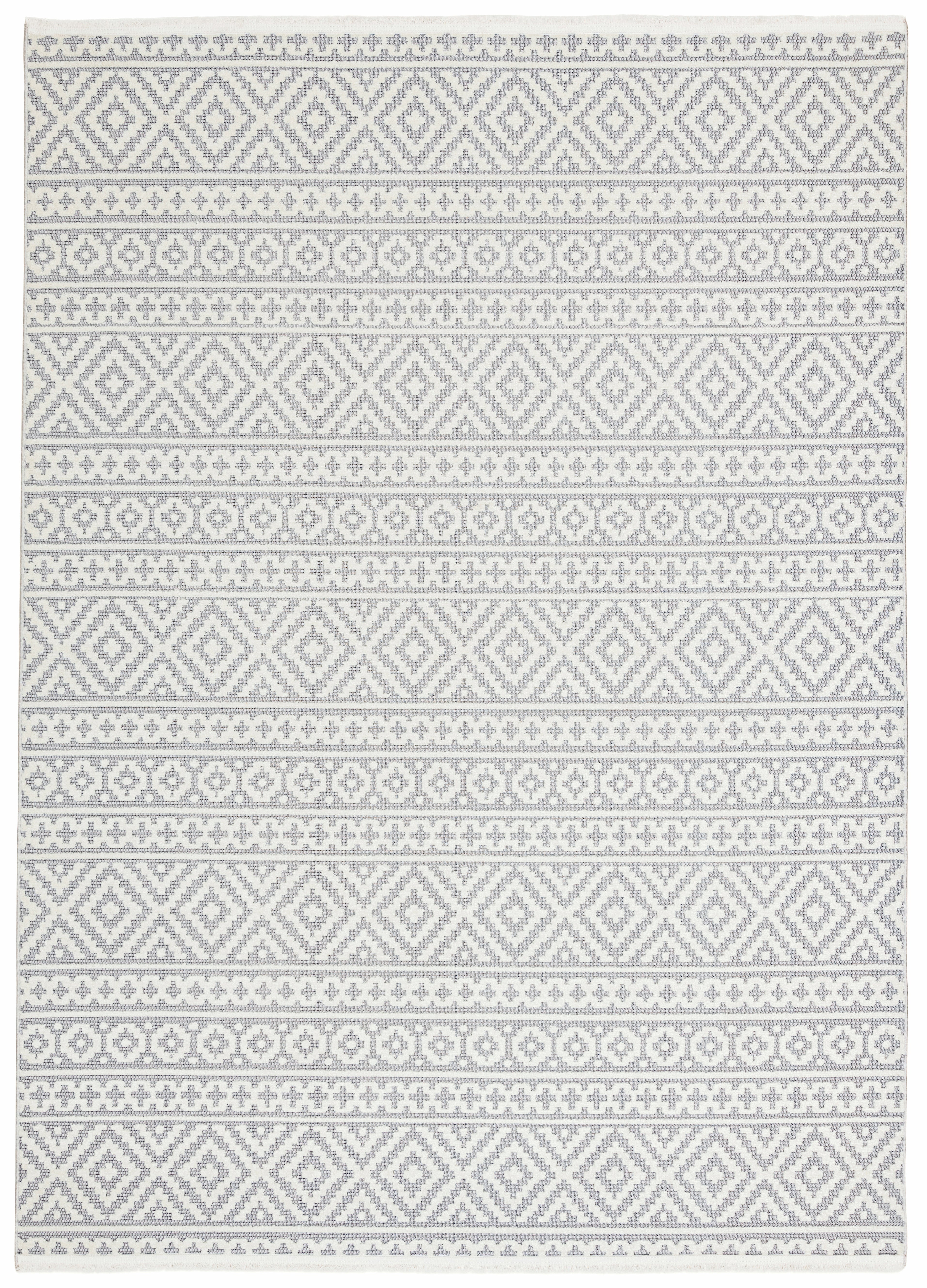 The Concept Looms Jazz Silver Jaz04 combines modern geometric design with eco-friendly durability. Made from 100% recycled polypropylene, this machine-woven rug features soft silver and ivory tones that complement both indoor living spaces and outdoor areas such as patios, balconies, or garden lounges.