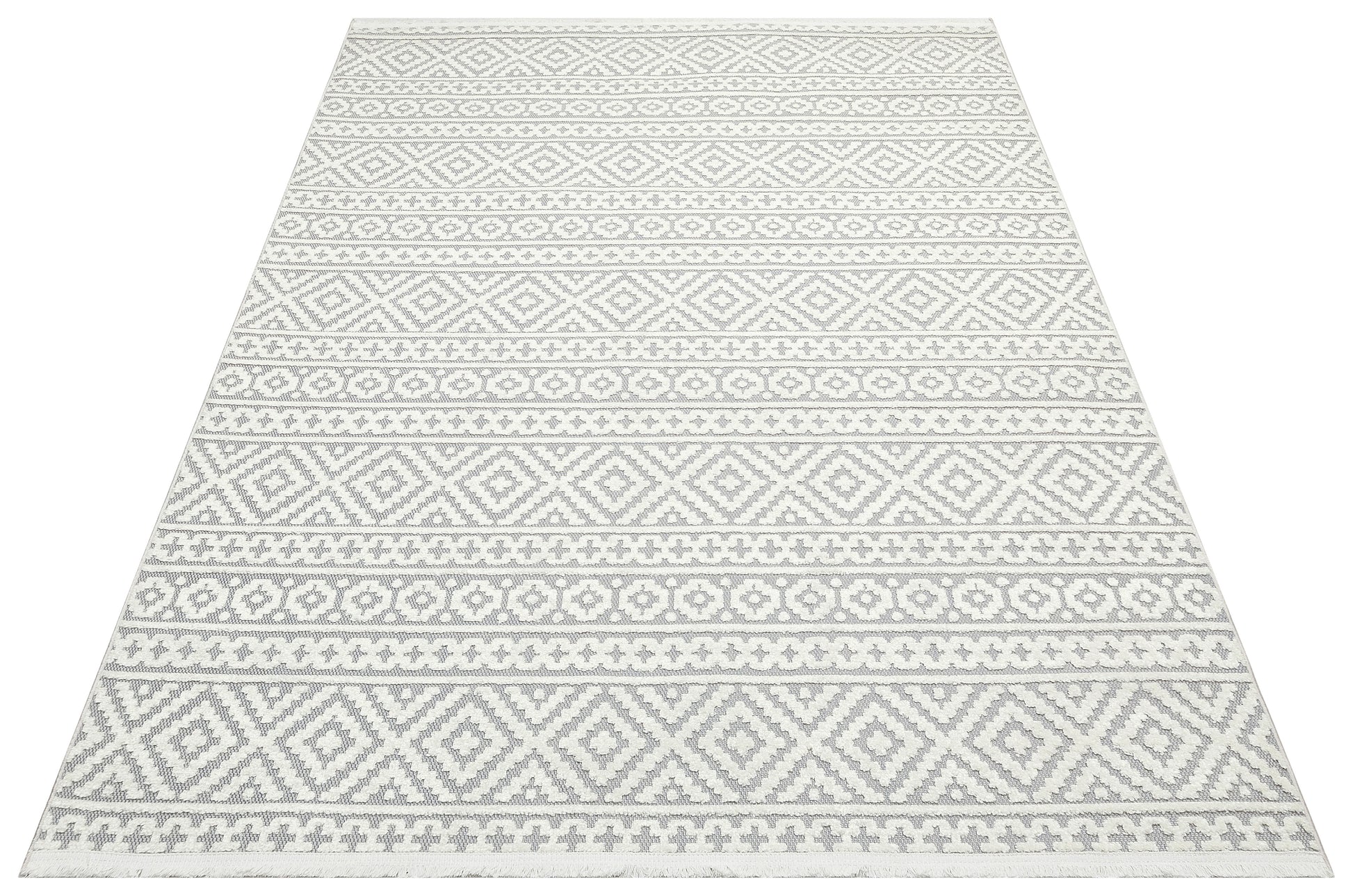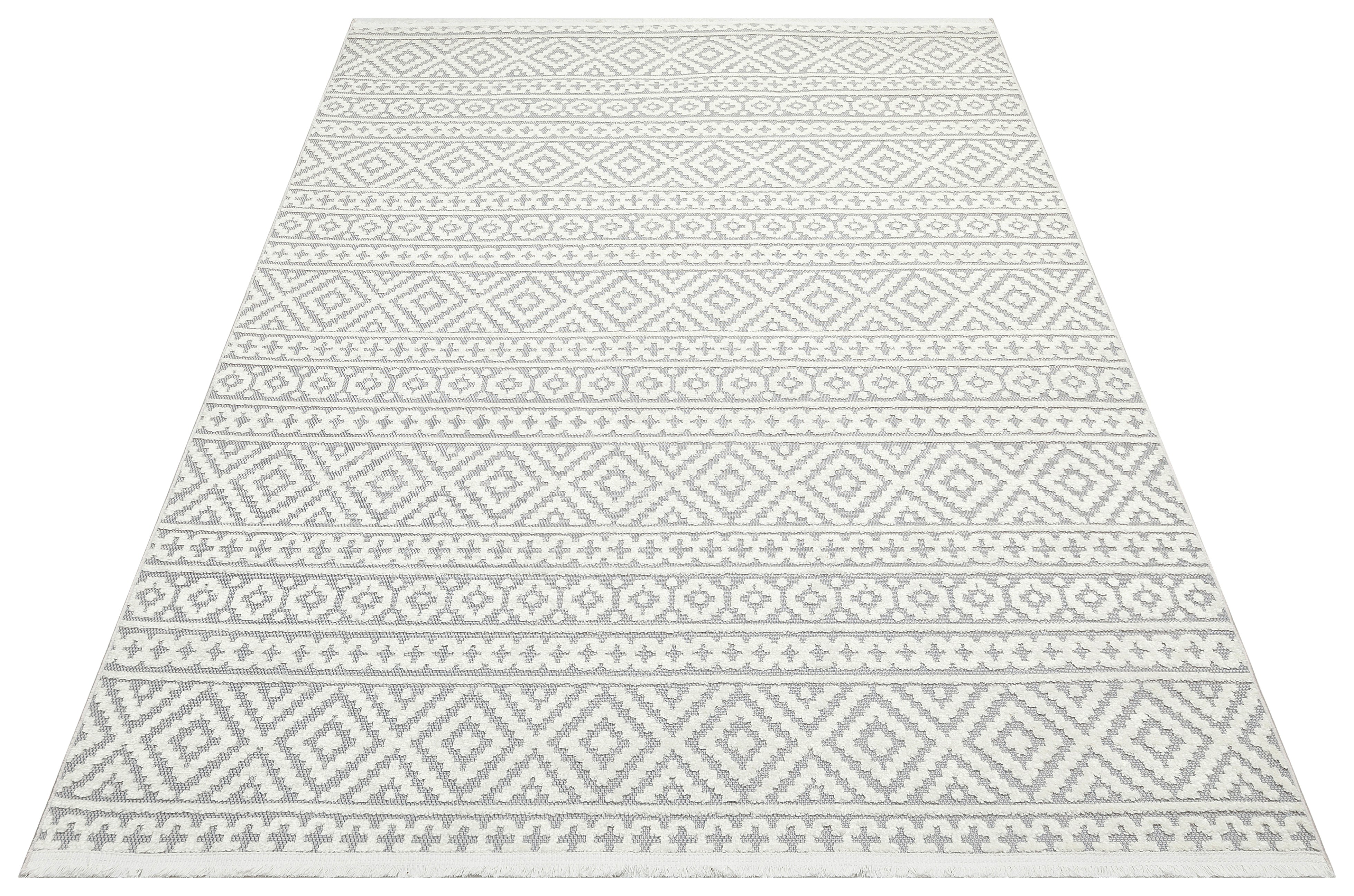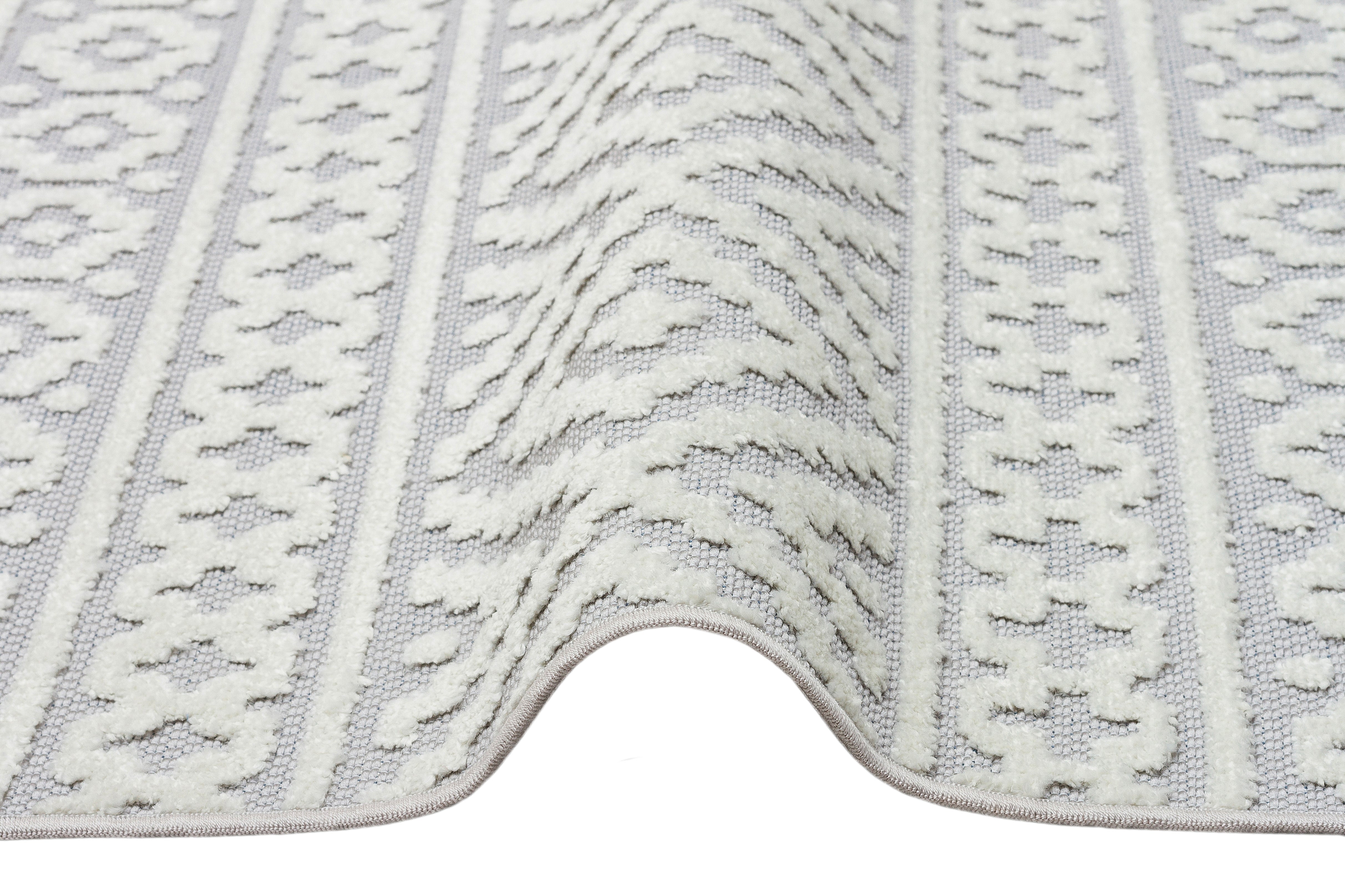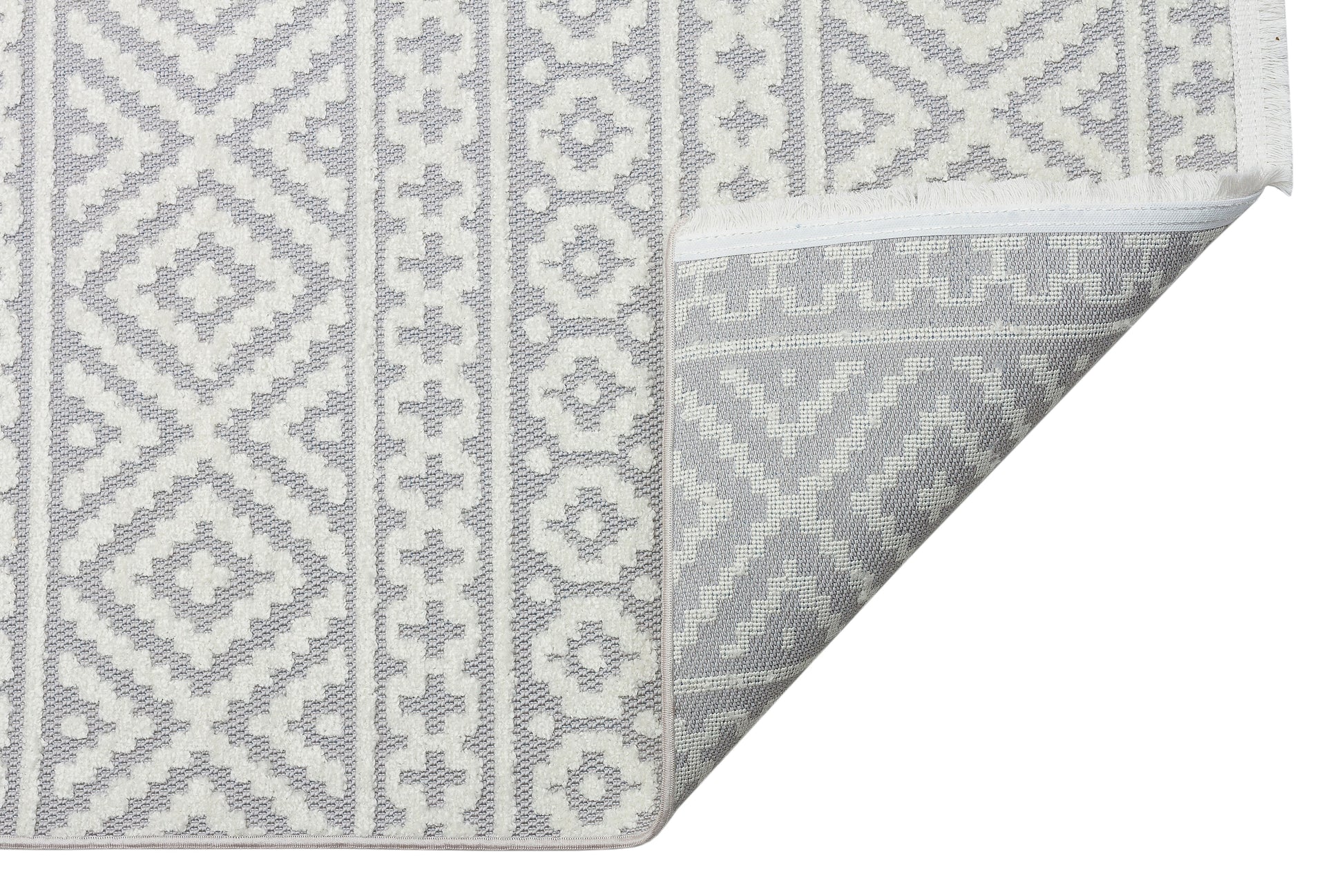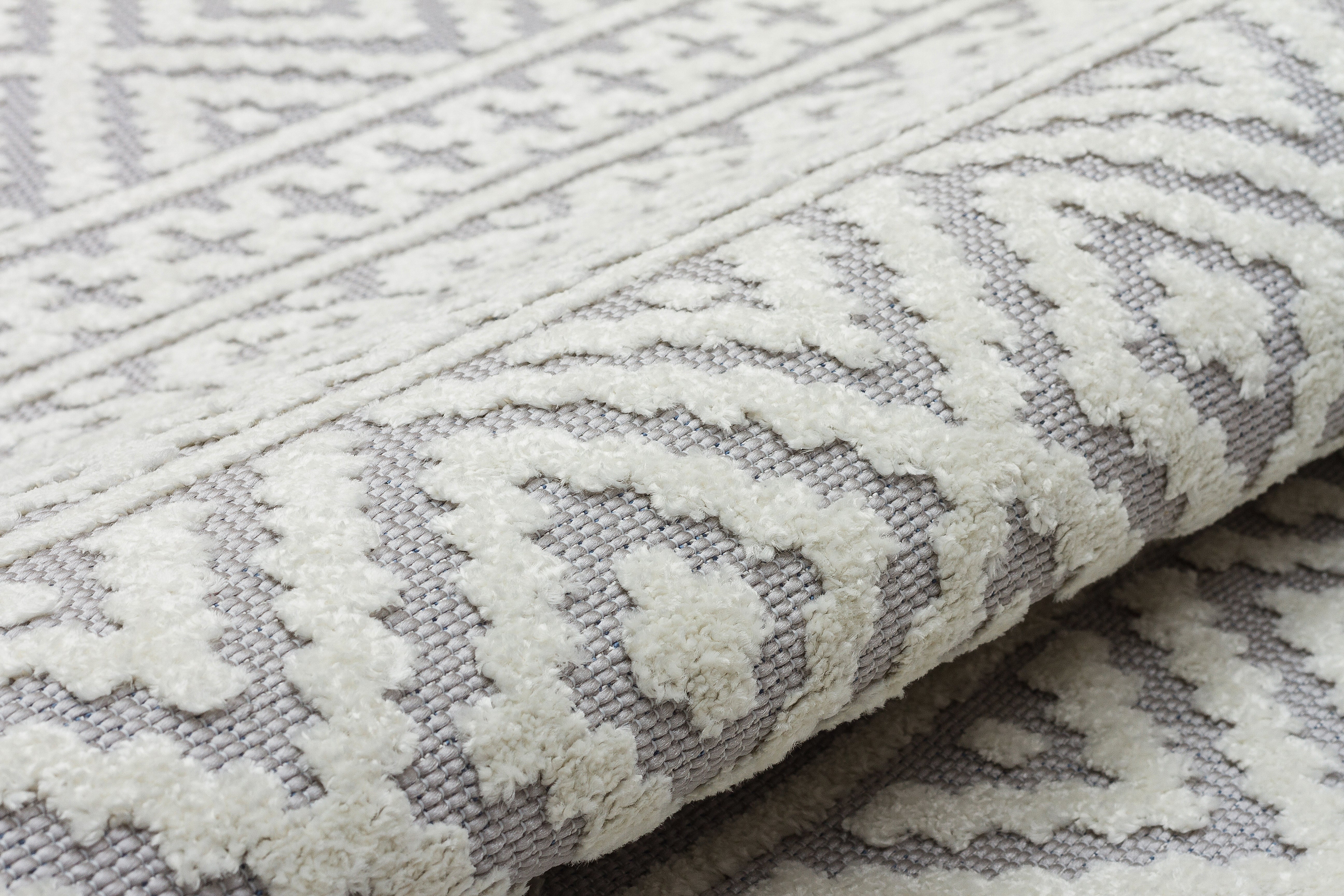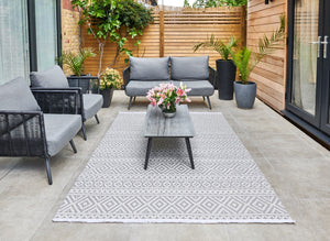 The Concept Looms Jazz Silver Jaz04 combines modern geometric design with eco-friendly durability. Made from 100% recycled polypropylene, this machine-woven rug features soft silver and ivory tones that complement both indoor living spaces and outdoor areas such as patios, balconies, or garden lounges.