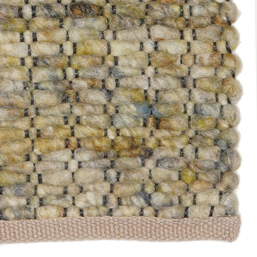 Each Firenze 27 rug is handwoven in Morocco from 100% natural wool. The mustard tone is rich but matte, grounded by the depth of the fibres. The blue accents are woven in gently — barely noticeable from a distance, but there when the light shifts. The result is a rug that feels handcrafted, expressive, and full of quiet depth.