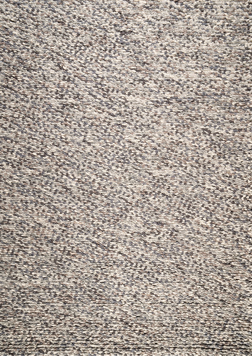 Handwoven wool rug with a blend of greys, taupes, and beige