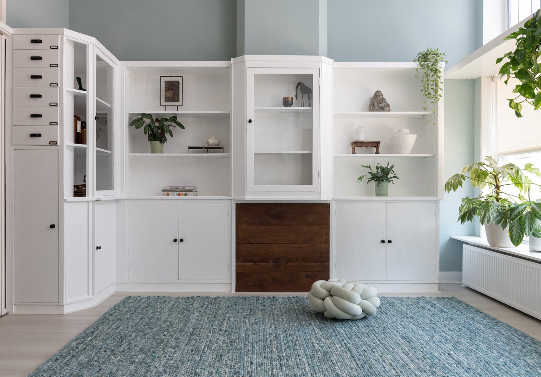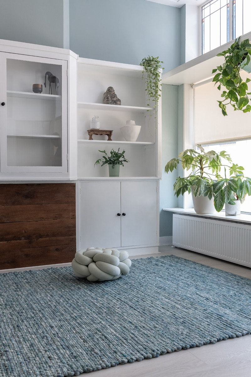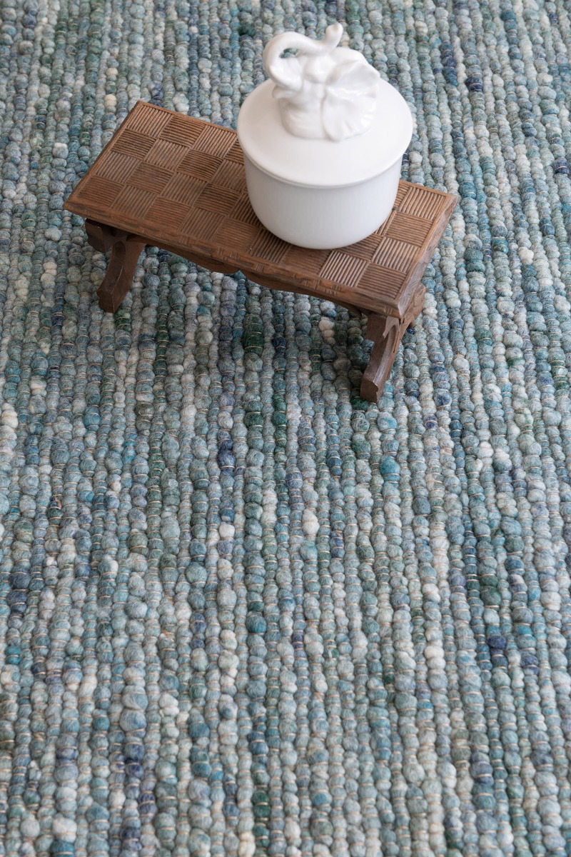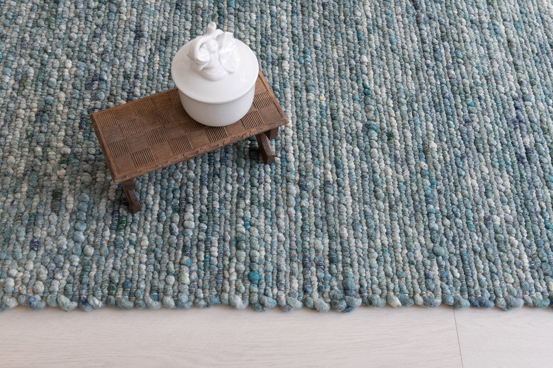 Venezia 16 captures the tranquil spirit of water with its soothing blue and aqua tones, woven into a tactile pebble-like texture. This handwoven wool rug adds a cool, calming presence to your living space, perfect for creating serene and stylish interiors.