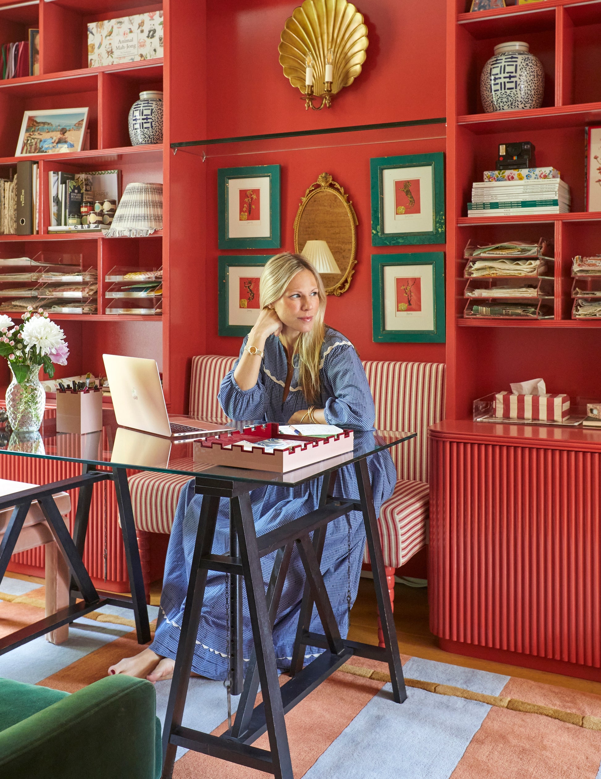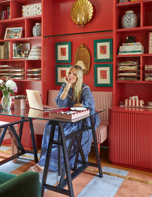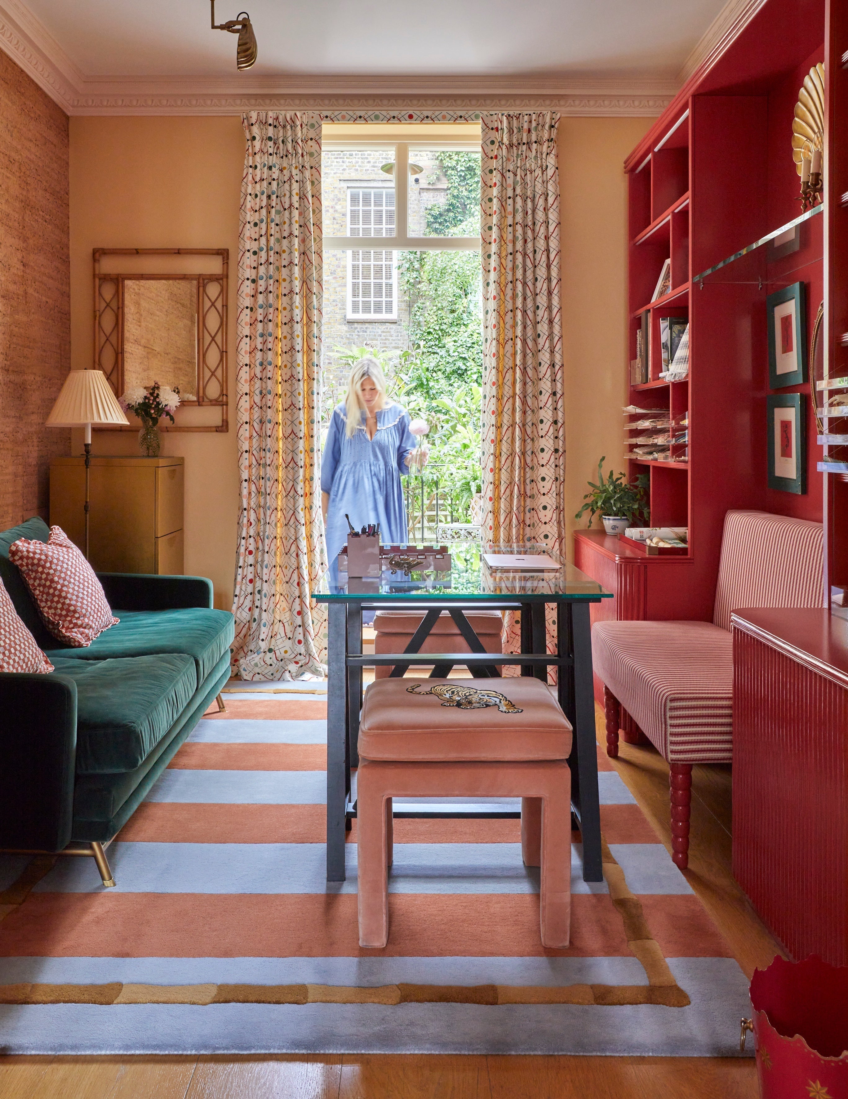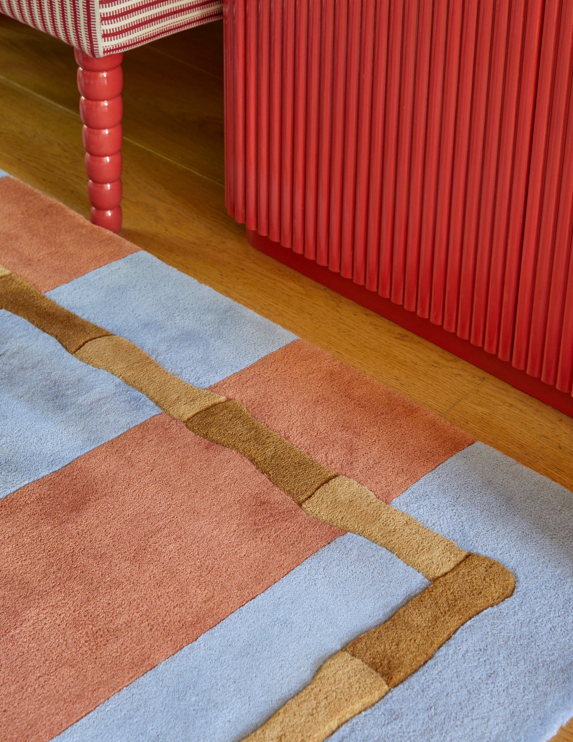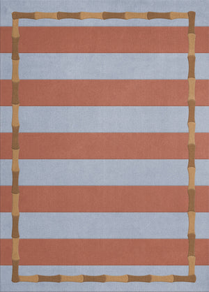 This handtufted wool rug from the Alice Crawley collection by Layered showcases a bold striped design in deep blue and rust, finished with a distinctive border that frames the entire piece. The bamboo-inspired lines are more defined in this edition, bringing contrast, rhythm, and subtle graphic strength to modern interiors.