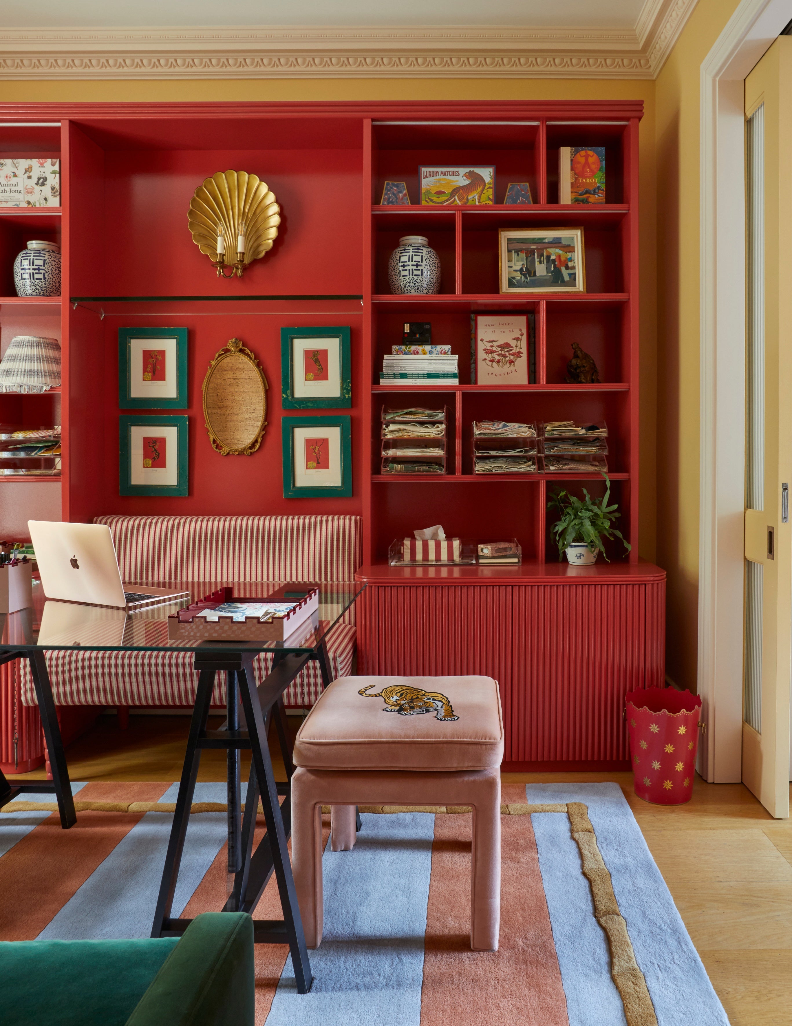 Styling tip: Combine with dark wood, terracotta, or burnt orange accents to echo the warmth of the rust tone. A curved sofa or modernist coffee table enhances the bold yet balanced energy of the piece.