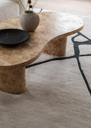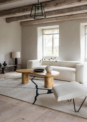 Let this rug anchor a minimalist space with clean lines and muted tones. Think matte finishes, tactile materials like linen or stone, and sculptural lighting to echo its rhythm. Works beautifully on concrete, pale wood, or grey-toned floors.