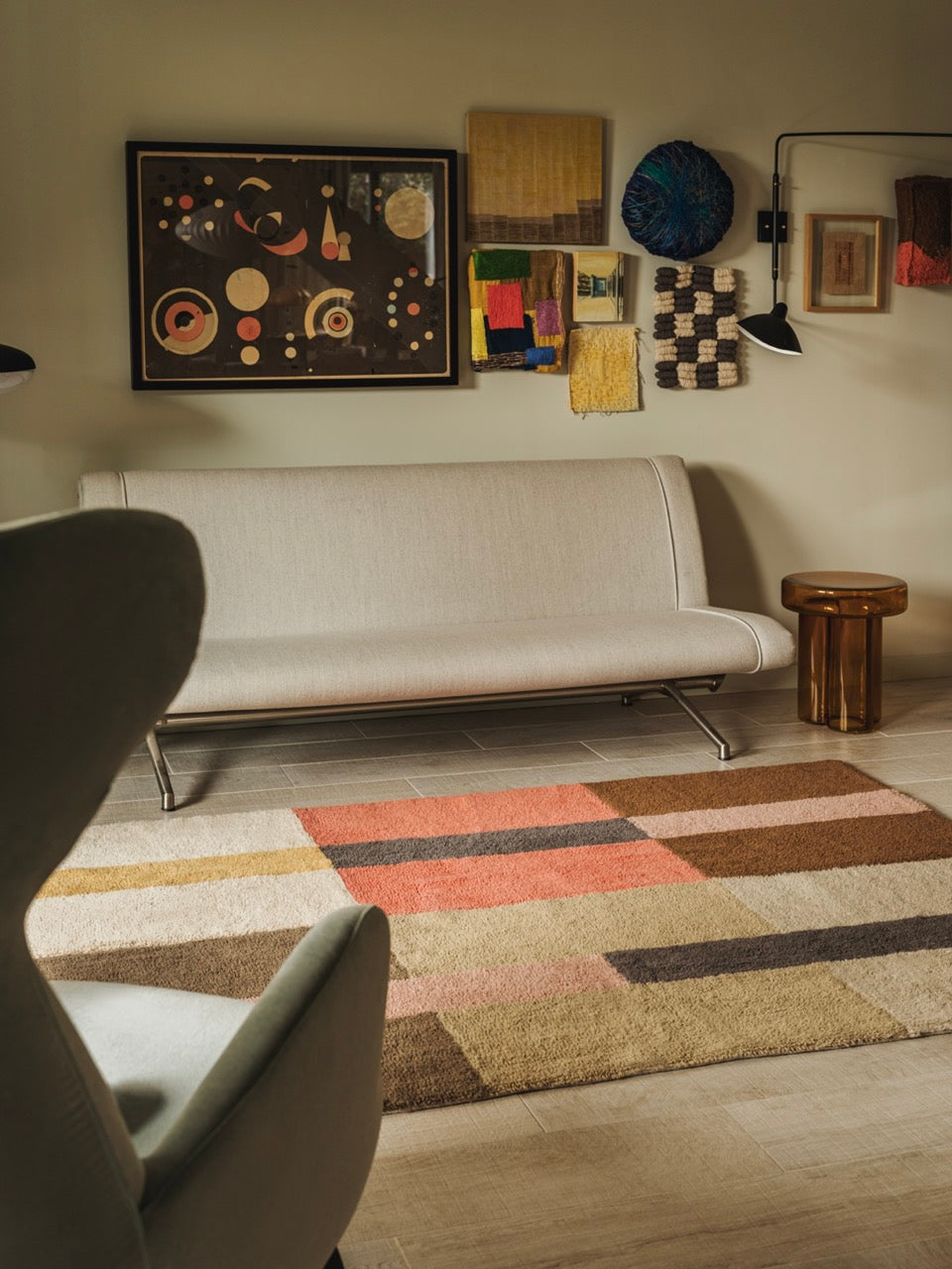 Part of the iconic Chroma Stripes collection, this rug is made from 100% RWS-certified wool with a recycled cotton backing, combining natural softness with durable, eco-friendly construction. Its dynamic color palette adds personality and warmth to bedrooms, living rooms, or creative workspaces.