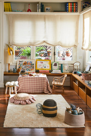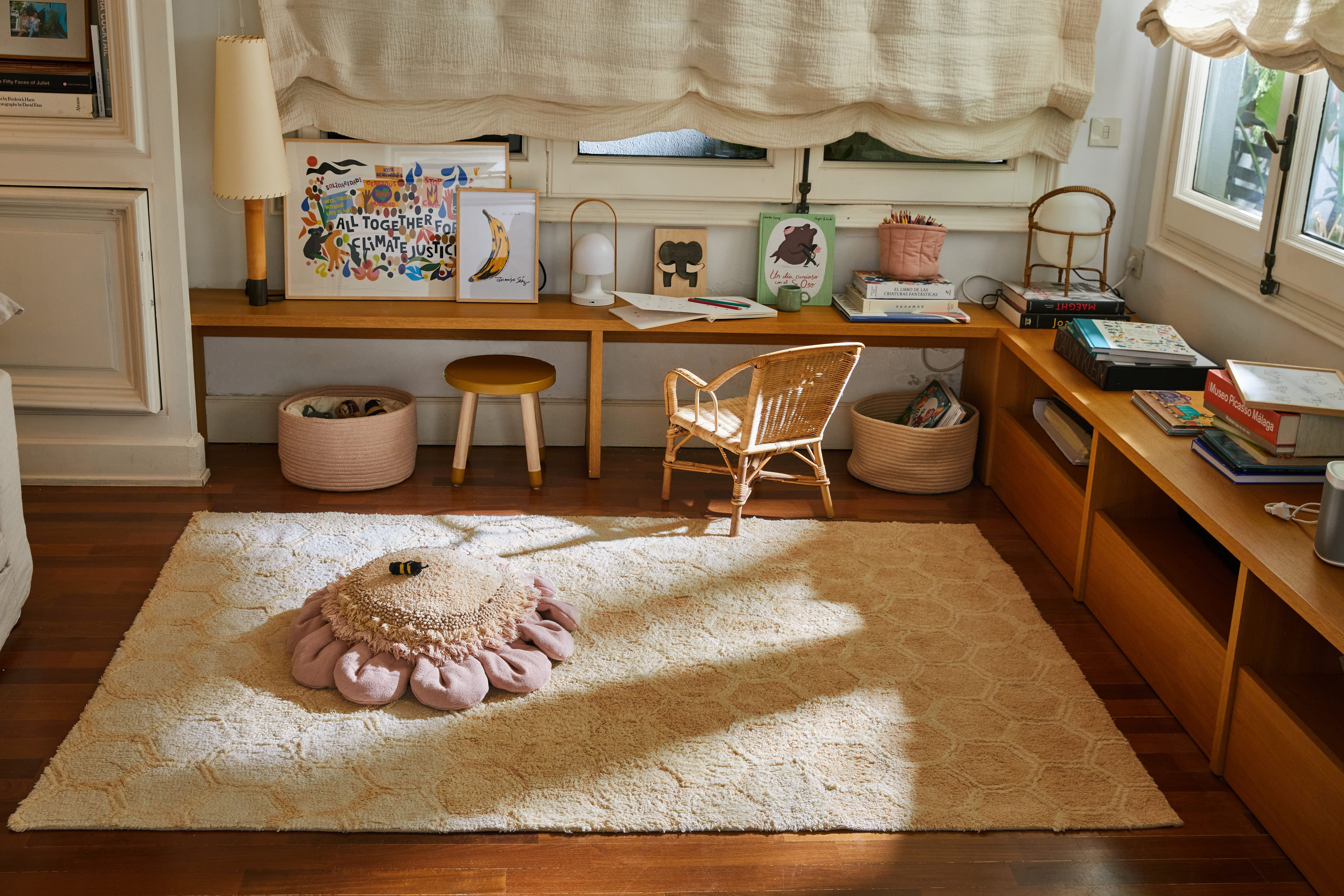 Add natural charm and playful geometry to your child’s room with the Lorena Canals Planet Bee Sweet Honey rug. Made from 100% organic cotton, this rug features a warm honey color palette and a design inspired by the intricate patterns of a bee’s nest, creating a cozy and breathable surface perfect for nurseries and playrooms.
