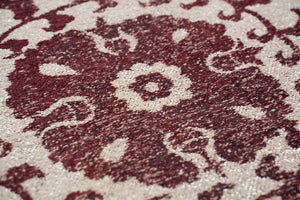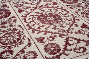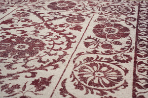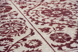 The Louis de Poortere Antiquarian Suzani Zephyr 9734 is a stunning fusion of neutral elegance and rich red detailing, inspired by the intricate artistry of traditional Suzani embroidery. Featuring a soft beige and taupe background accented by deep red floral and medallion motifs, this rug creates a warm, inviting atmosphere while maintaining a refined, vintage appeal. The balanced contrast between the subtle base and striking patterns makes it an ideal statement piece for both classic and contemporary interiors.