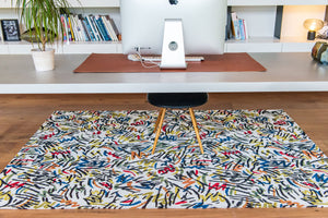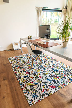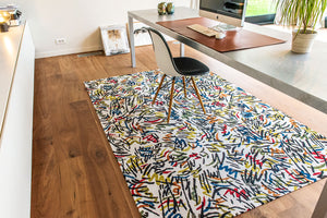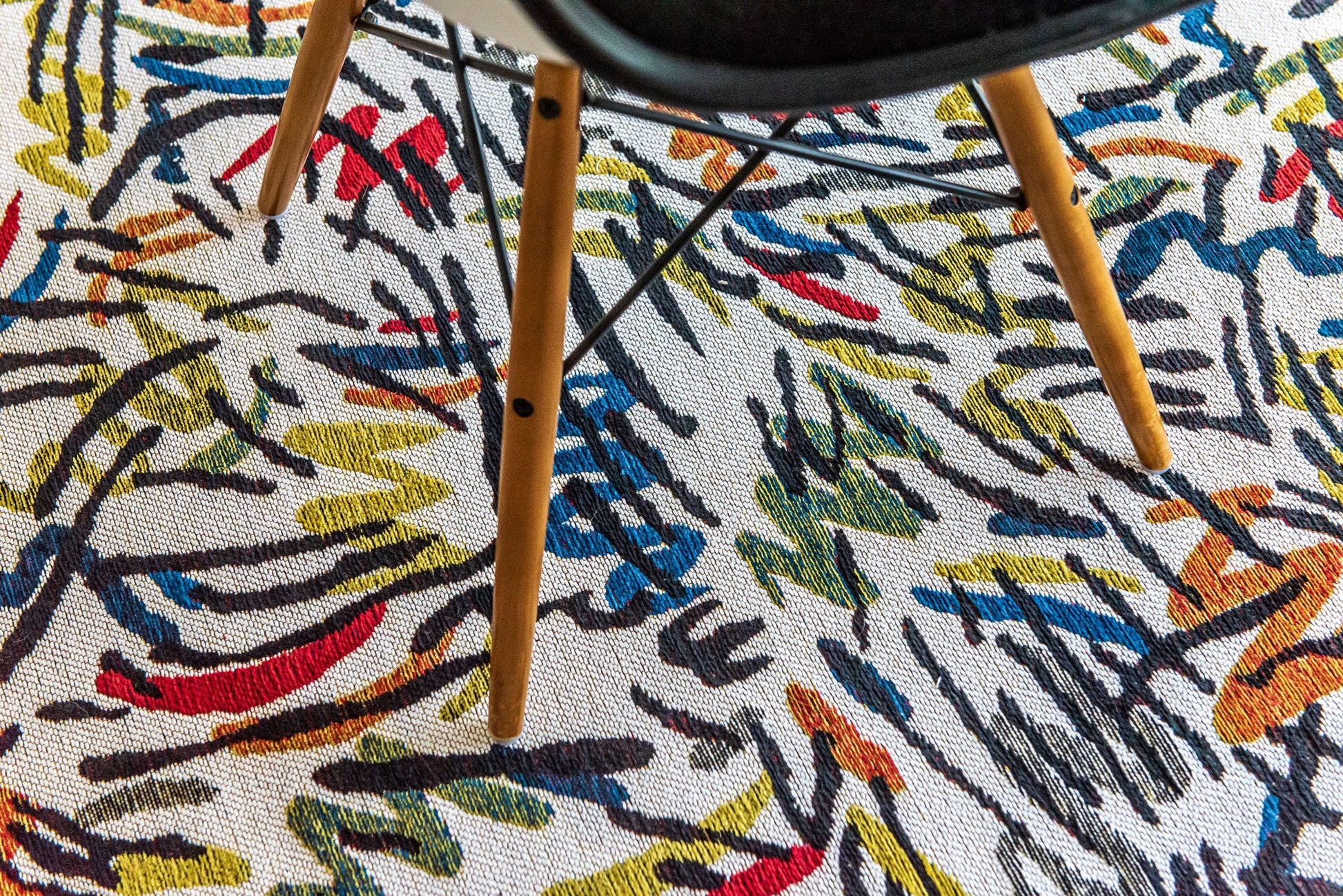 Introducing the Louis de Poortere Gallery Graffito Street Graph 9144 rug, a modern and eclectic design from Belgium. Made with PET fibers, this abstract jacquard flatweave rug is available in multicolor options. With sizes ranging from 100 x 140 cm to 200 x 280 cm, it is perfect for any living room, dining room, or kitchen. Not only is it anti-allergic and anti-static, but it also adds a unique touch to any space with its contemporary design. Add a pop of color and style to your home with this stunning rug from Louis de Poortere.