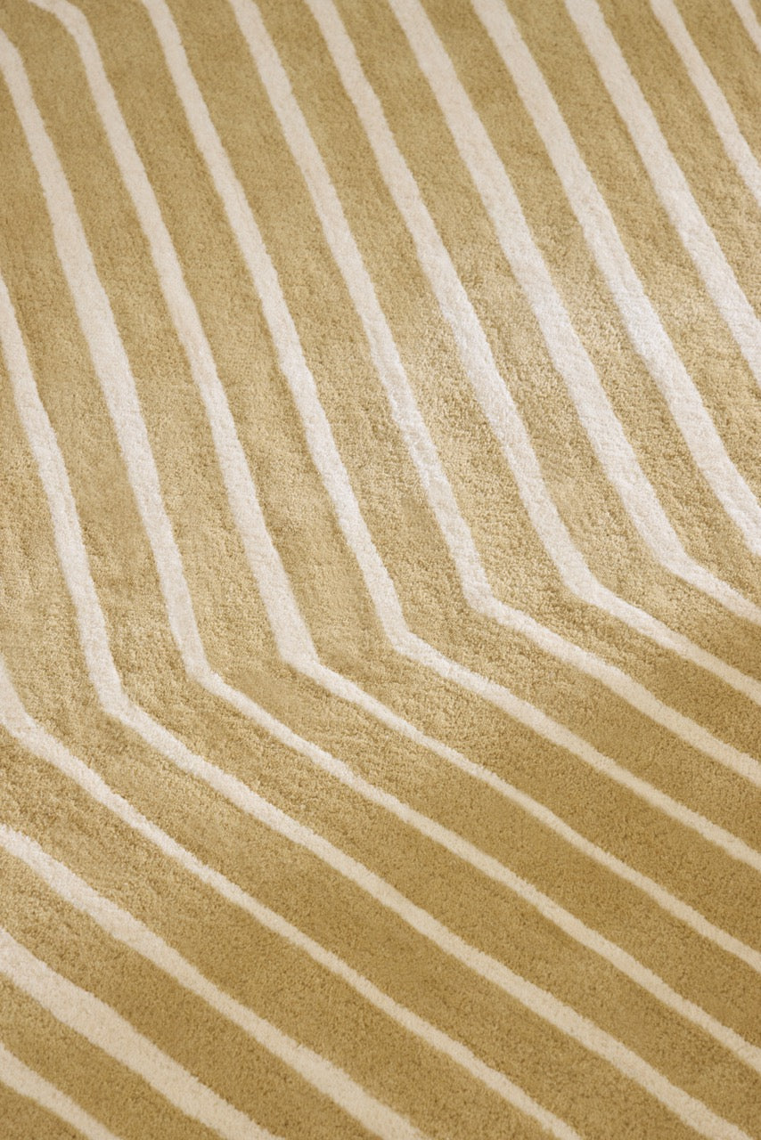 Kalasaaski Brass is a rug for interiors that prefer structure over decoration. The flowing stripe pattern introduces rhythm without becoming dominant, while the warm brass colour softens the graphic lines and keeps the room balanced.