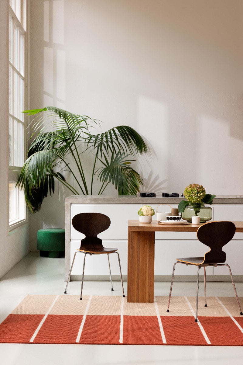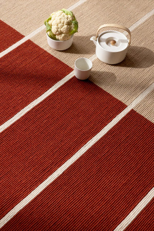 The warm tones and geometric design of the Tiibet rug make it a versatile addition to various interior styles, including modern, Scandinavian, and minimalist decors. Its bold stripes can anchor a living room, complement a dining area, or add a pop of color to a bedroom. The rug's neutral beige accents allow it to pair effortlessly with a range of furniture and color schemes, enhancing the overall aesthetic of your space.