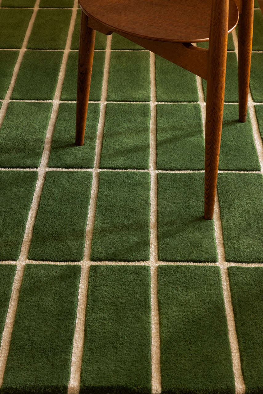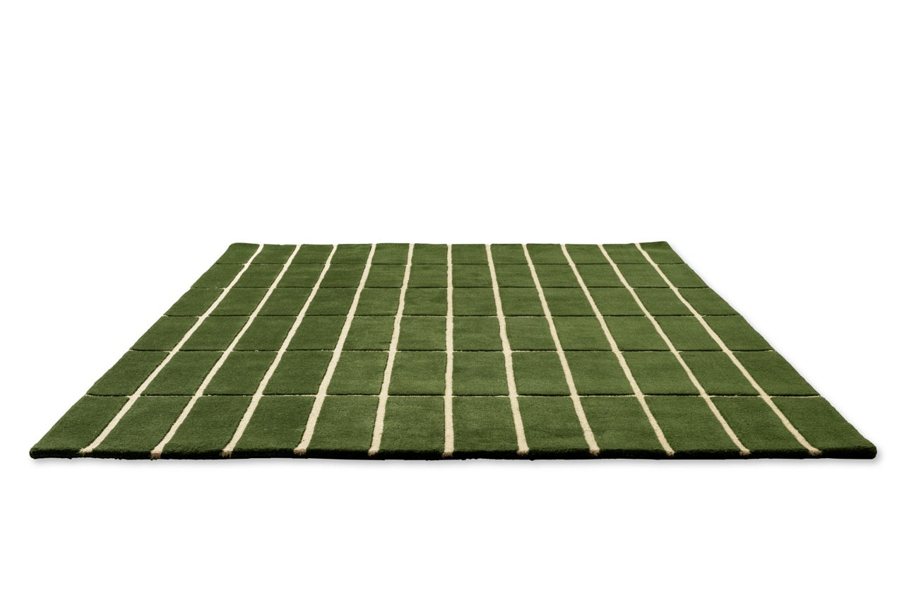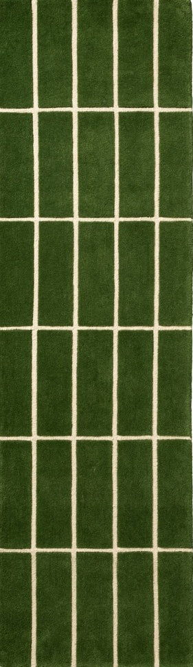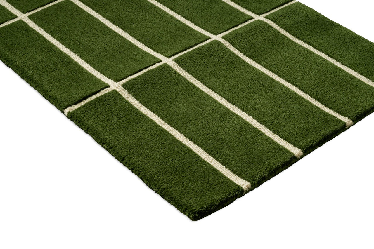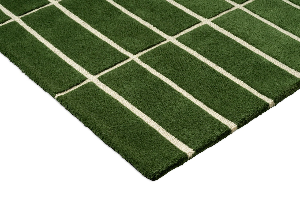 The Marimekko Tiiliskivi Green 132907 brings the iconic brick pattern into a calm, nature-inspired palette. The deep green tone softens the graphic grid and adds warmth and balance, making this rug feel grounded without becoming heavy.