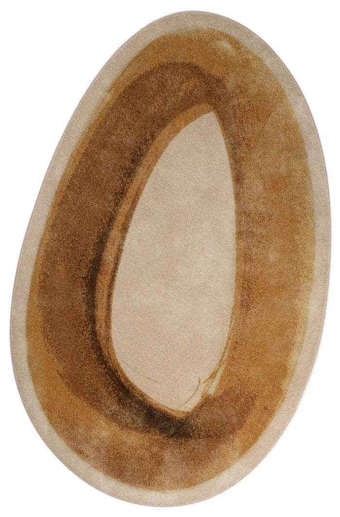 The warm ochre tones evoke earthy landscapes and cozy interiors, pairing effortlessly with wooden furniture, leather accents, and neutral textiles. Its oval silhouette softens angular room layouts and introduces a gentle flow, making it a standout piece for contemporary, rustic, or Scandinavian-inspired interiors.
