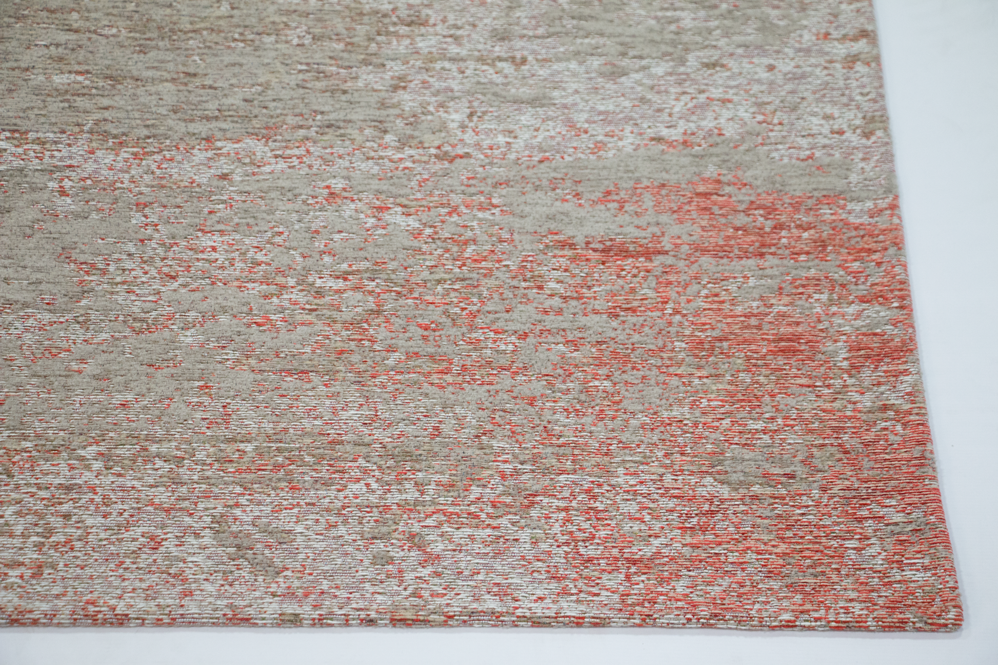 Mart Visser Cendre Coral Red 44 is a machine-woven low-pile rug featuring an abstract coral and grey gradient design. Made from cotton, polyester, and chenille, it blends softness with durability for modern living spaces.