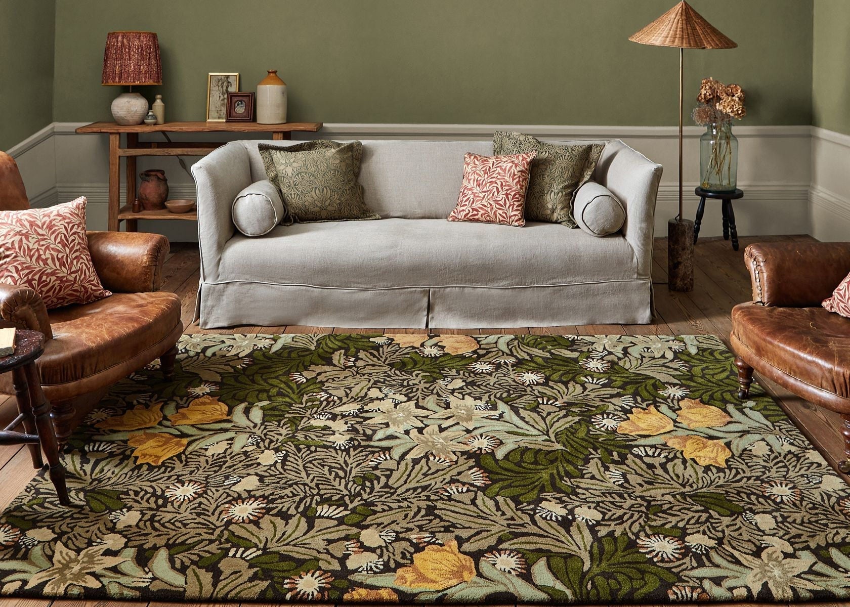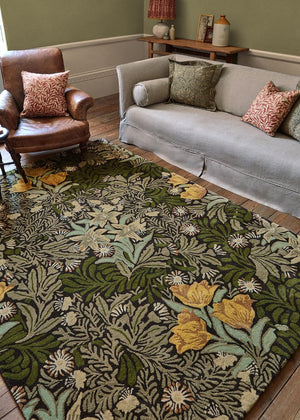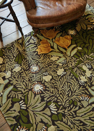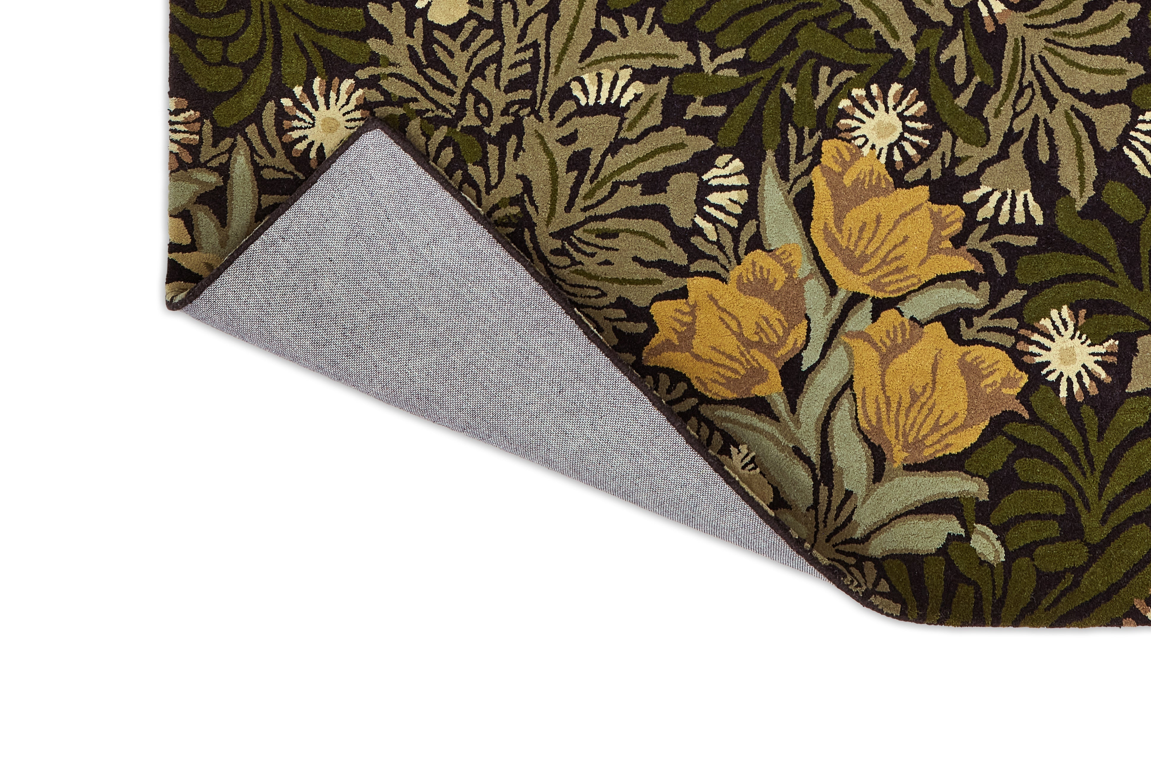 Bring natural sophistication to your home with the Morris & Co Bower Twining Vine Green 128207. This hand-tufted wool rug features the classic Bower pattern intertwined with graceful vine motifs in rich green shades, perfect for adding texture and life to any room.