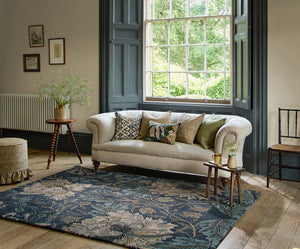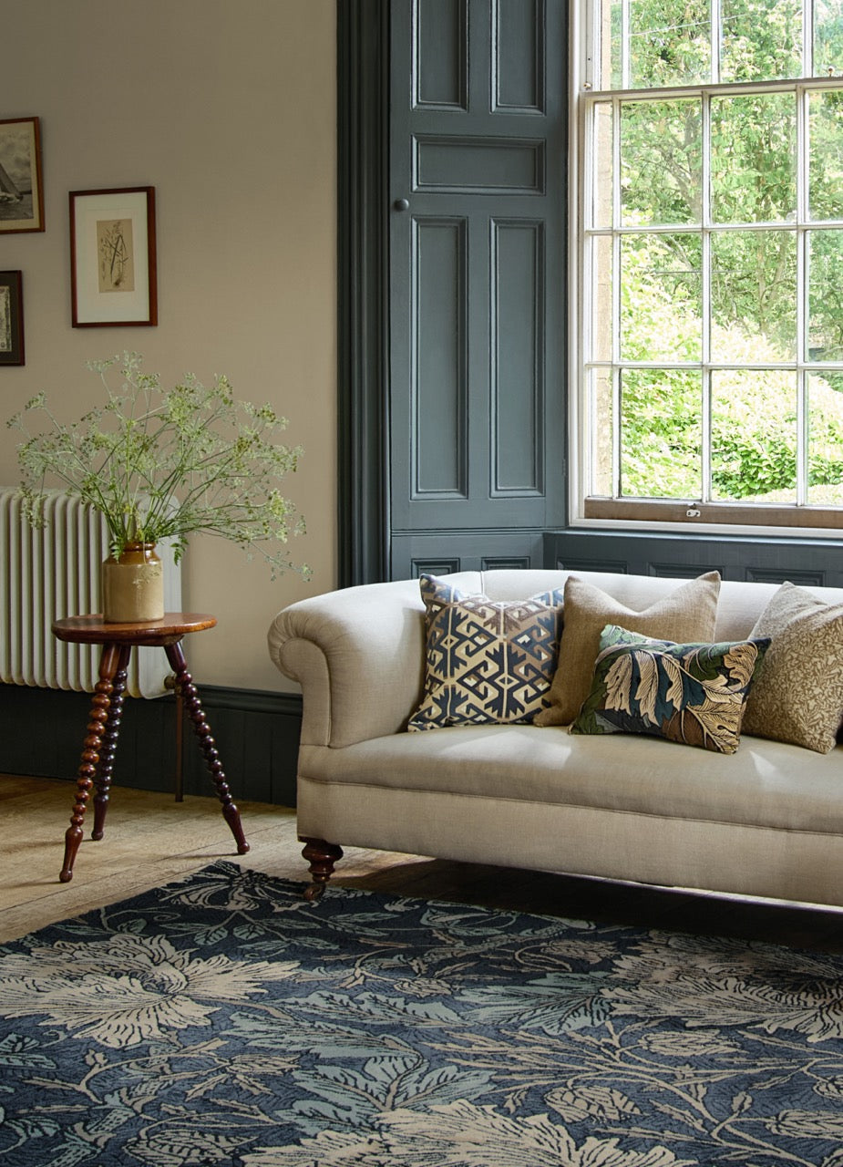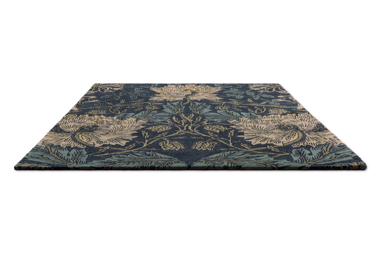 The Honeysuckle Woad & Tyme rug brings a calm yet expressive presence to the interior. Deep woad blue forms the backdrop for flowing botanical motifs in soft, natural tones, creating a design that feels rich, balanced and unmistakably Morris & Co.