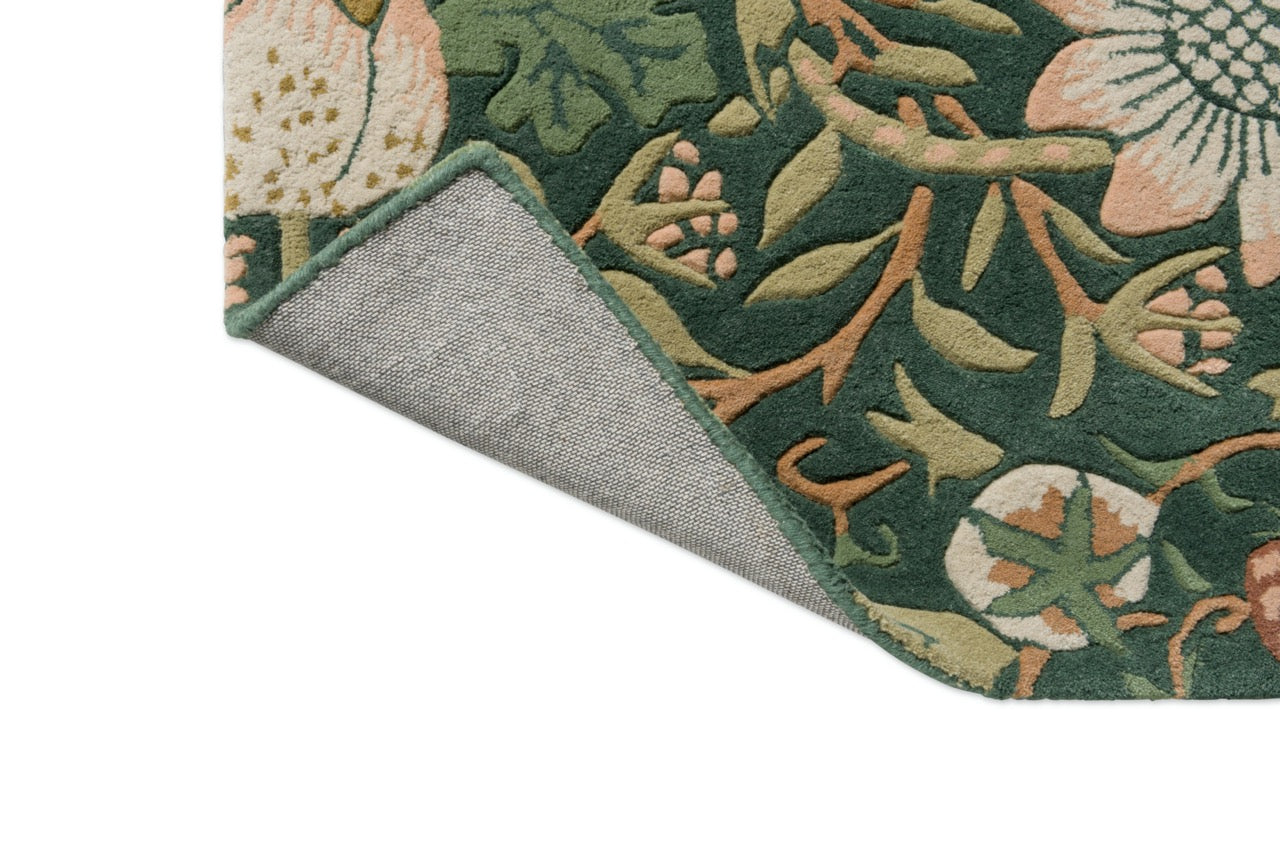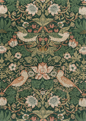 Strawberry Thief is not just a pattern, it is a story woven into wool. Against a deep forest-green background, small birds move between flowers and strawberries, creating a design that feels lively, layered and unmistakably Morris & Co.