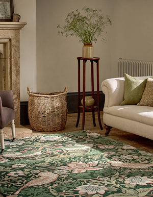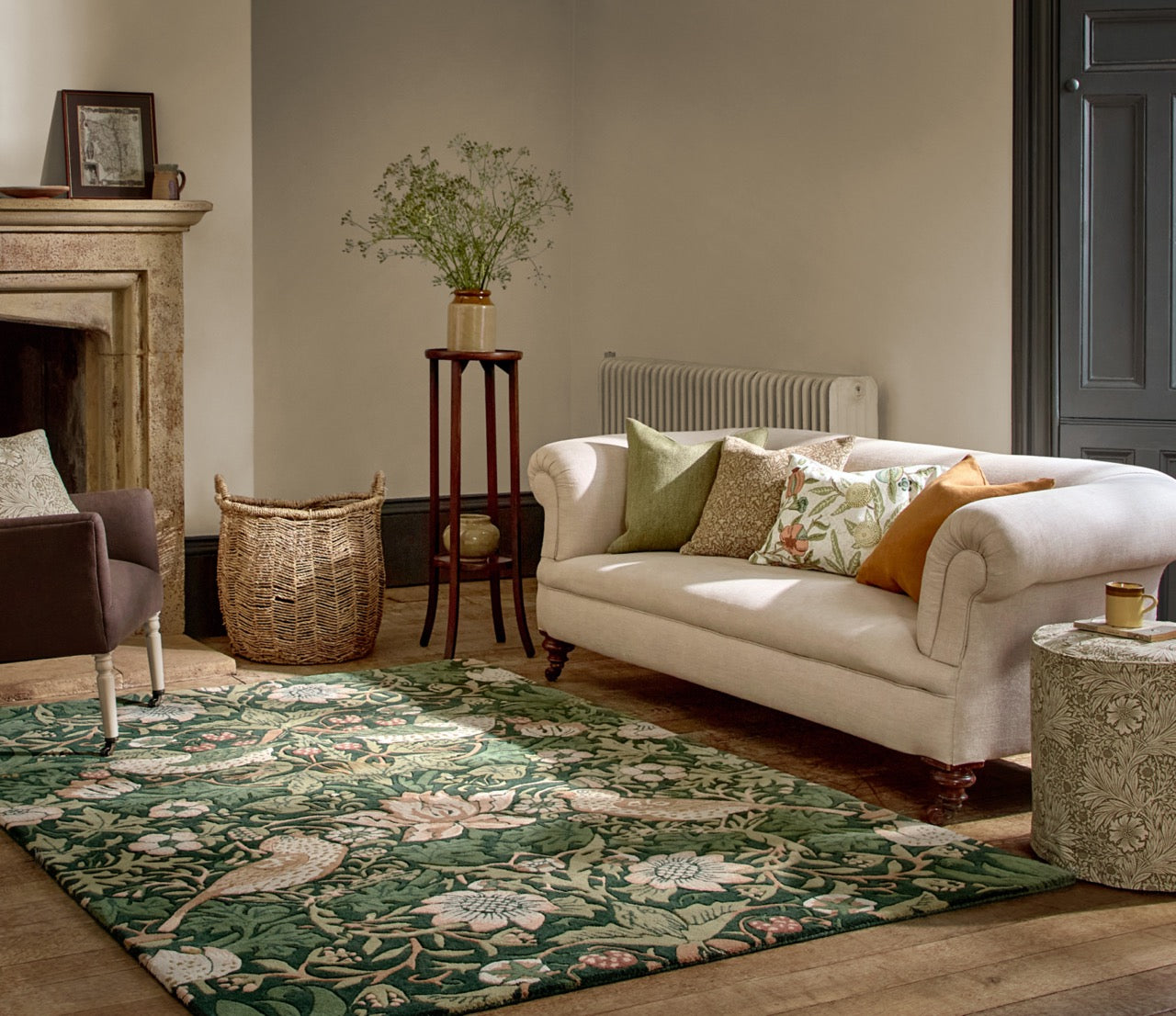 William Morris originally drew inspiration from the birds in his own garden, where they would steal fruit from beneath the plants. That moment of everyday nature became one of the most celebrated textile designs in history. On the floor, the pattern feels warm and expressive, yet balanced enough to live with day after day.