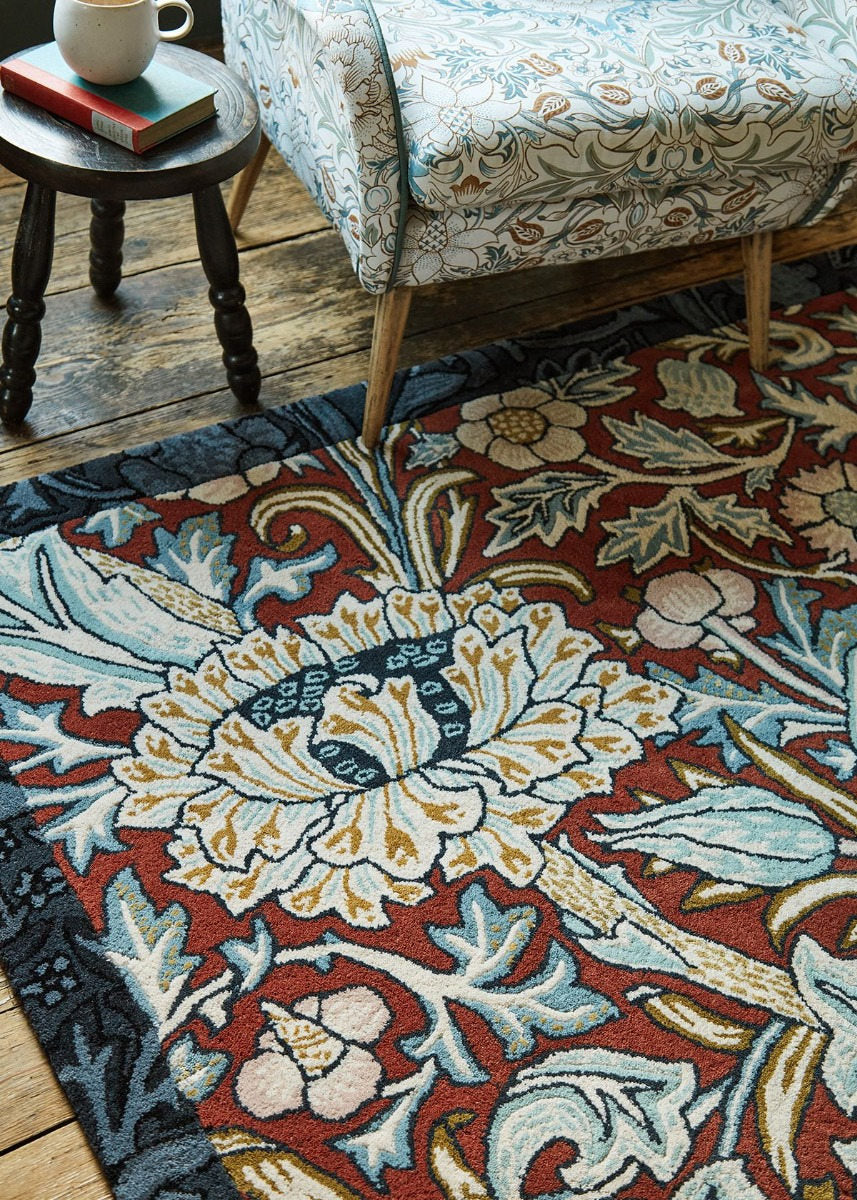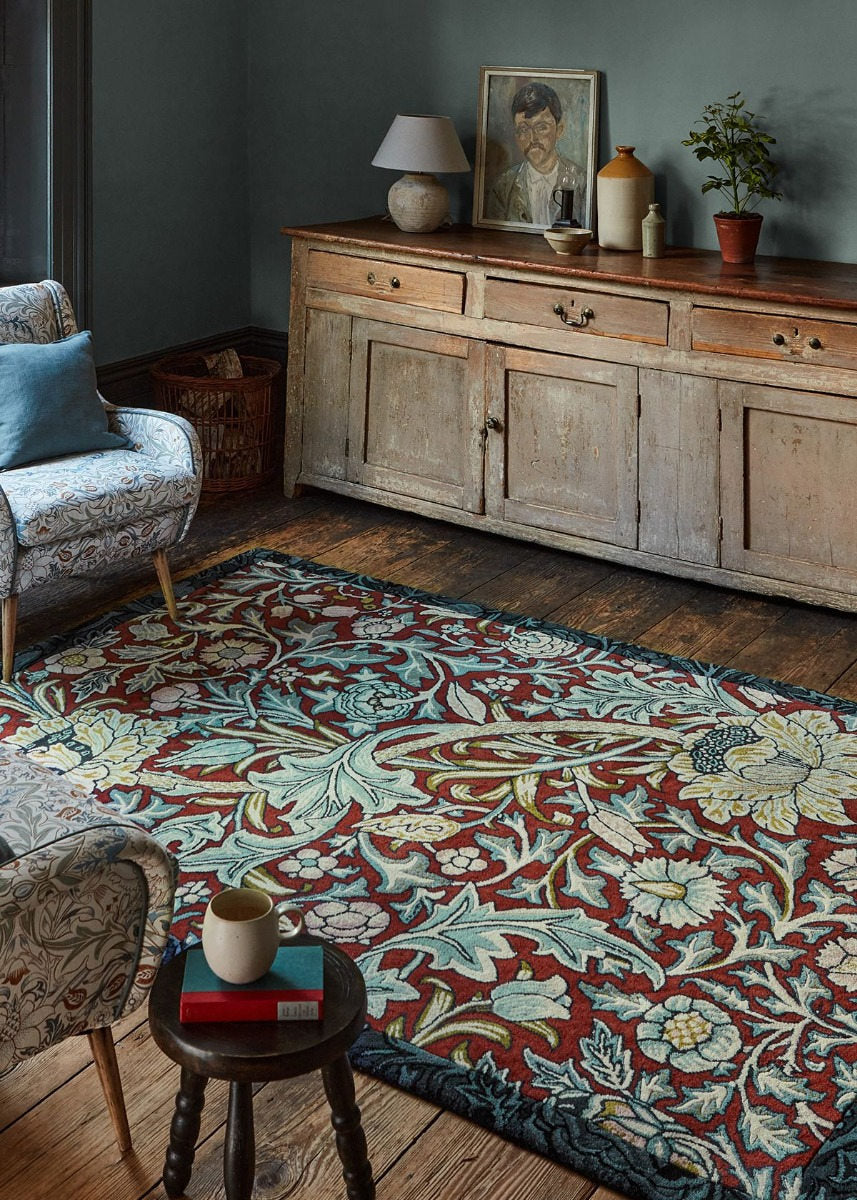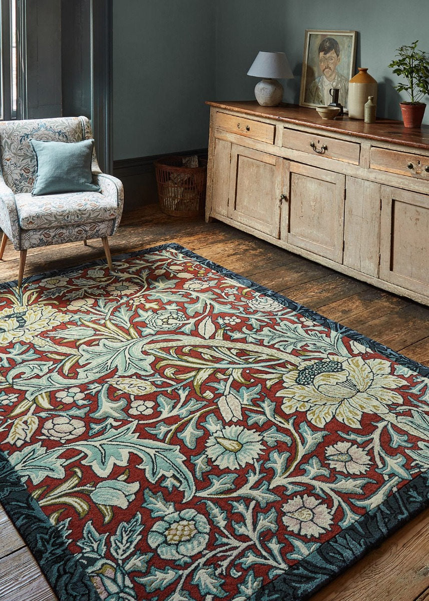 Inject a burst of color and classic charm into your home with the Morris & Co Trent Madder Red Webbs Blue 127510. This hand-tufted wool rug features the striking Trent pattern, blending rich madder red with deep webbs blue to create a lively yet sophisticated statement piece.