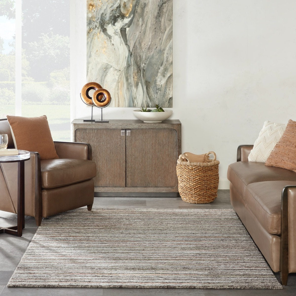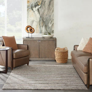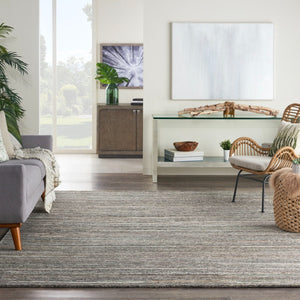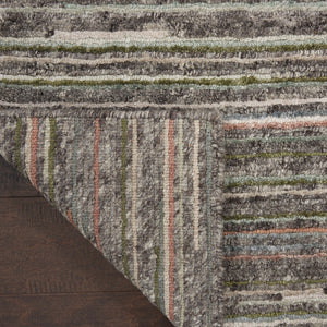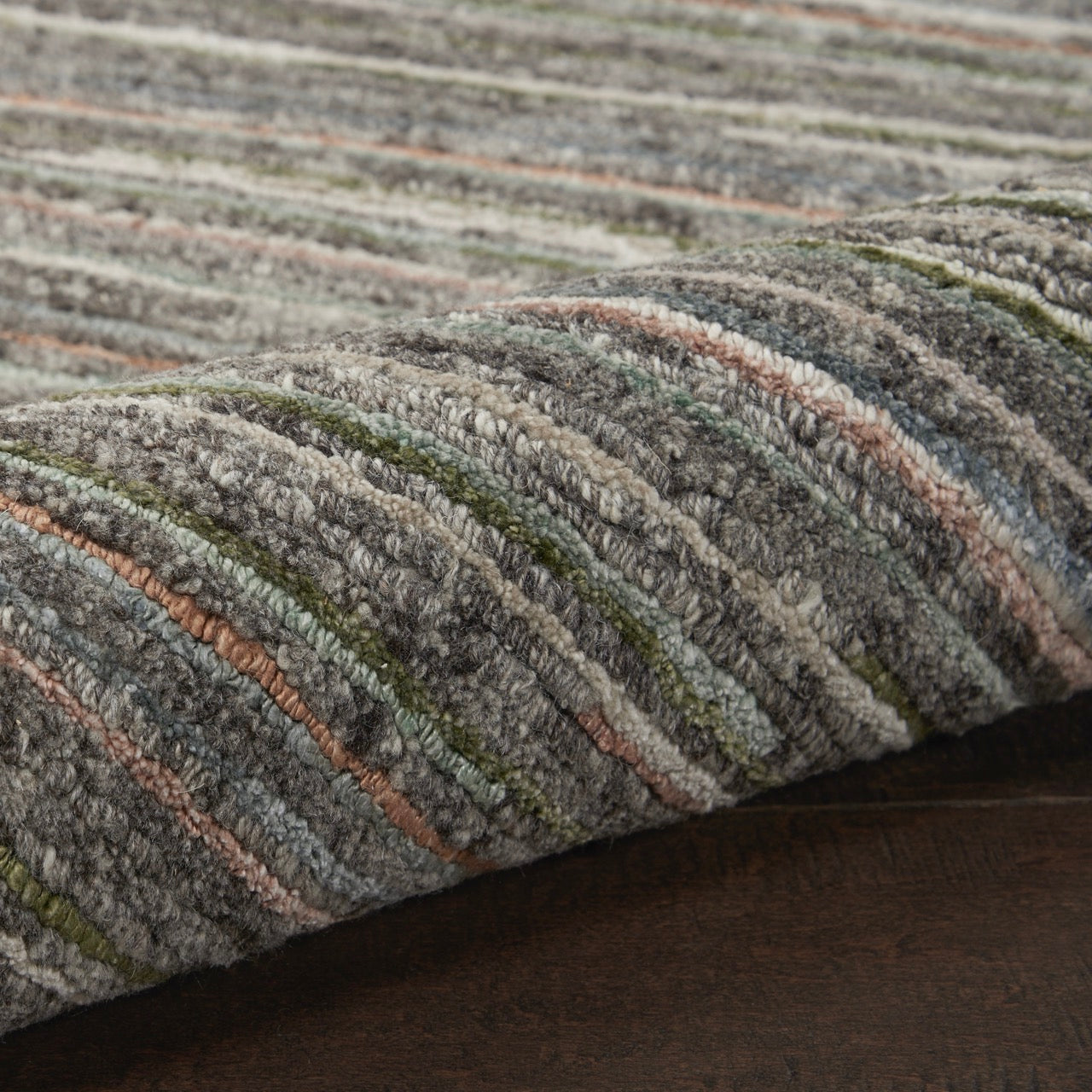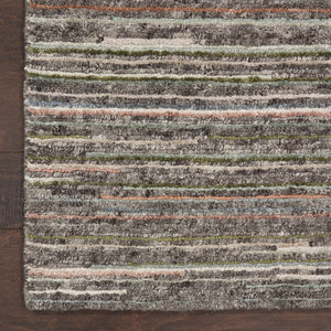 Introducing the Nourison Plateau Grey Green PAE01 rug, hand-knotted in India with high-quality wool. This modern piece features a unique striped design with a beautiful gradation of colors, making it a perfect addition to any living or dining room. Not only is it anti-allergic and anti-static, but it also comes in two versatile sizes to fit your space perfectly. Elevate your home decor with this multicolored masterpiece from Nourison.