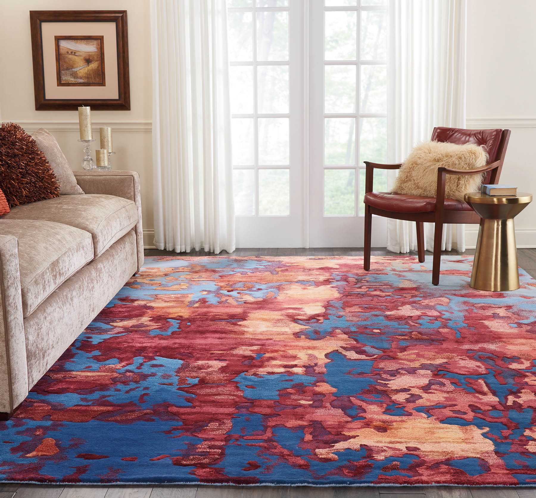 Introducing the Nourison Prismatic Blue Flame PRS13 rug, handtufted in China with a blend of wool and Luxcelle fibers. This modern and eclectic design features an abstract pattern in shades of blue, perfect for adding a pop of color to any living or dining room. Anti-allergic and anti-static properties make this rug both stylish and practical. Available in multiple sizes to suit your space. Elevate your decor with this unique and high-quality piece from Nourison.