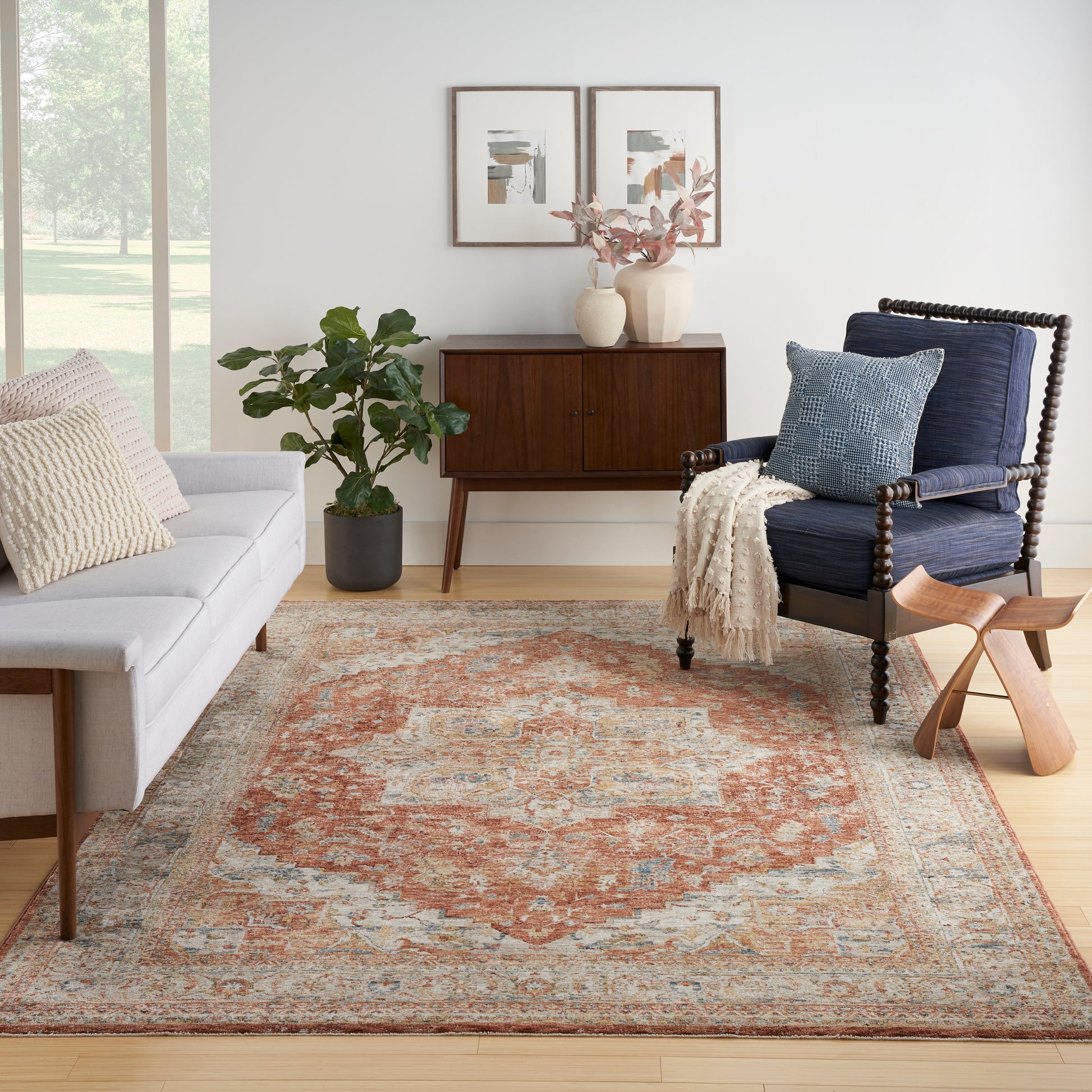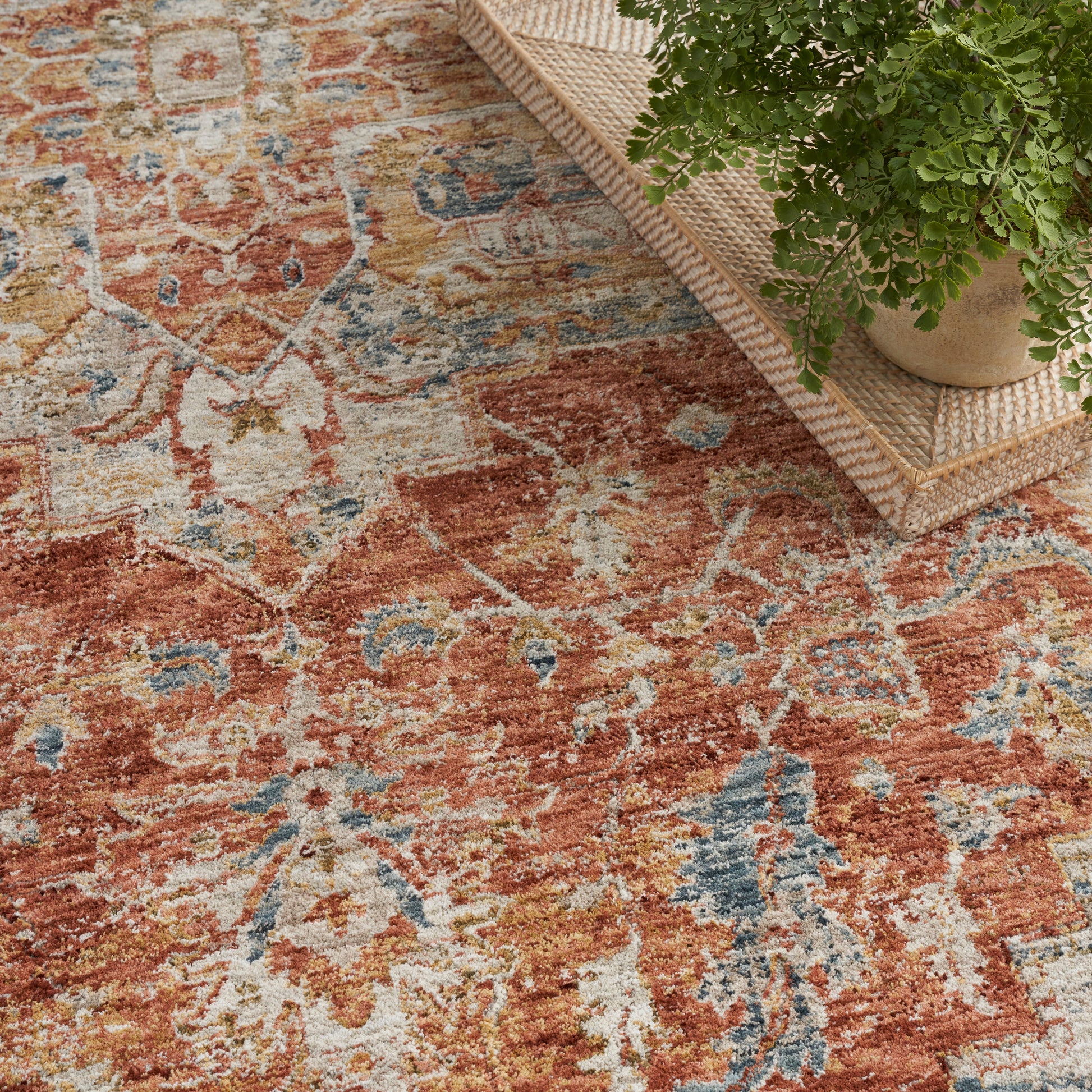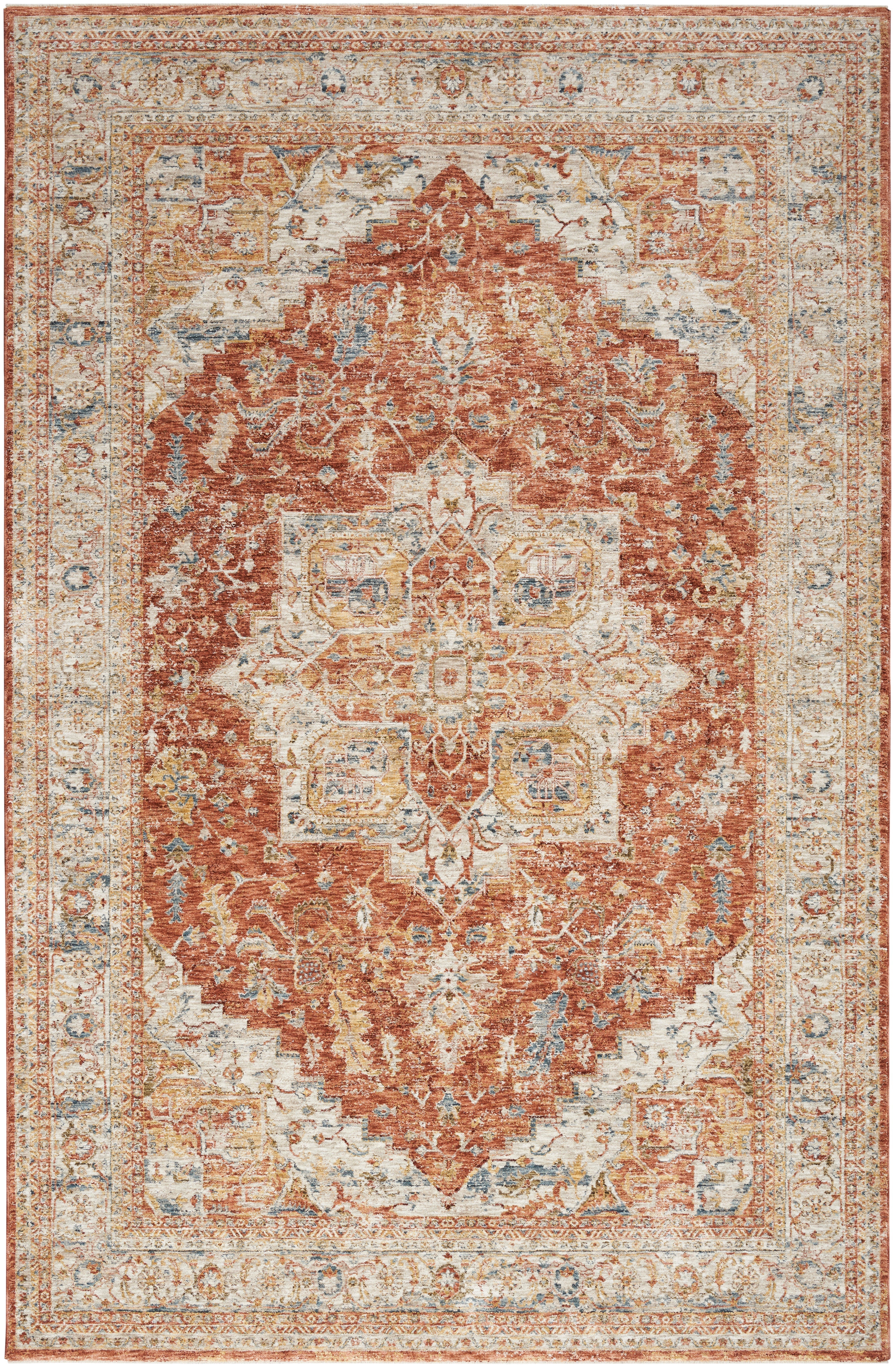 Introducing the Nourison Sahar Ivory Multicolour SHR06 rug, a stunning addition to any room in your home. Made in Turkey, this vintage-inspired rug features a classic design with ethnic and medallion motifs. Crafted from durable polyester, this woven carpet is available in various sizes to suit your space. The warm tones of orange and beige add a touch of elegance to your living room, dining room, or bedroom. Not only is this rug stylish, but it is also anti-allergic and anti-static, making it a practical choice for any home. Upgrade your decor with the Nourison Sahar Ivory Multicolour SHR06 rug today.