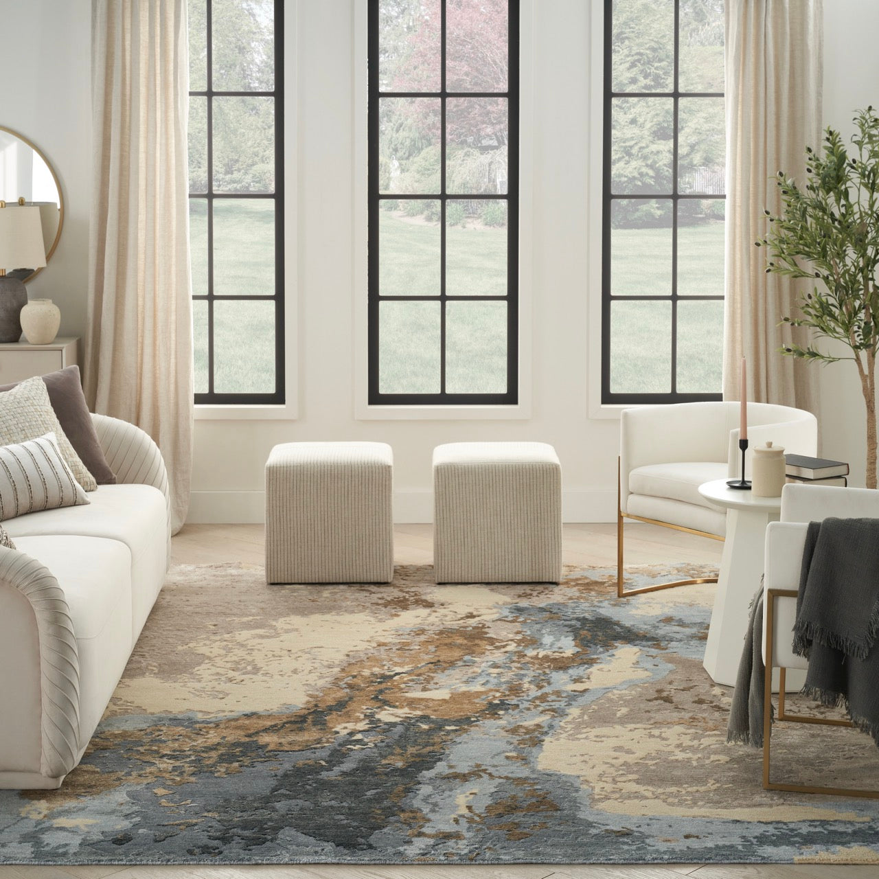 The Nourison Silk Shadows SHA23 Beige Blue combines soft beige tones with cool blue accents in a refined, abstract composition. The design feels calm and layered, with gentle colour transitions that add depth without overpowering the space.