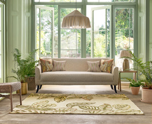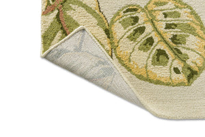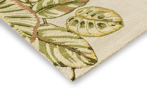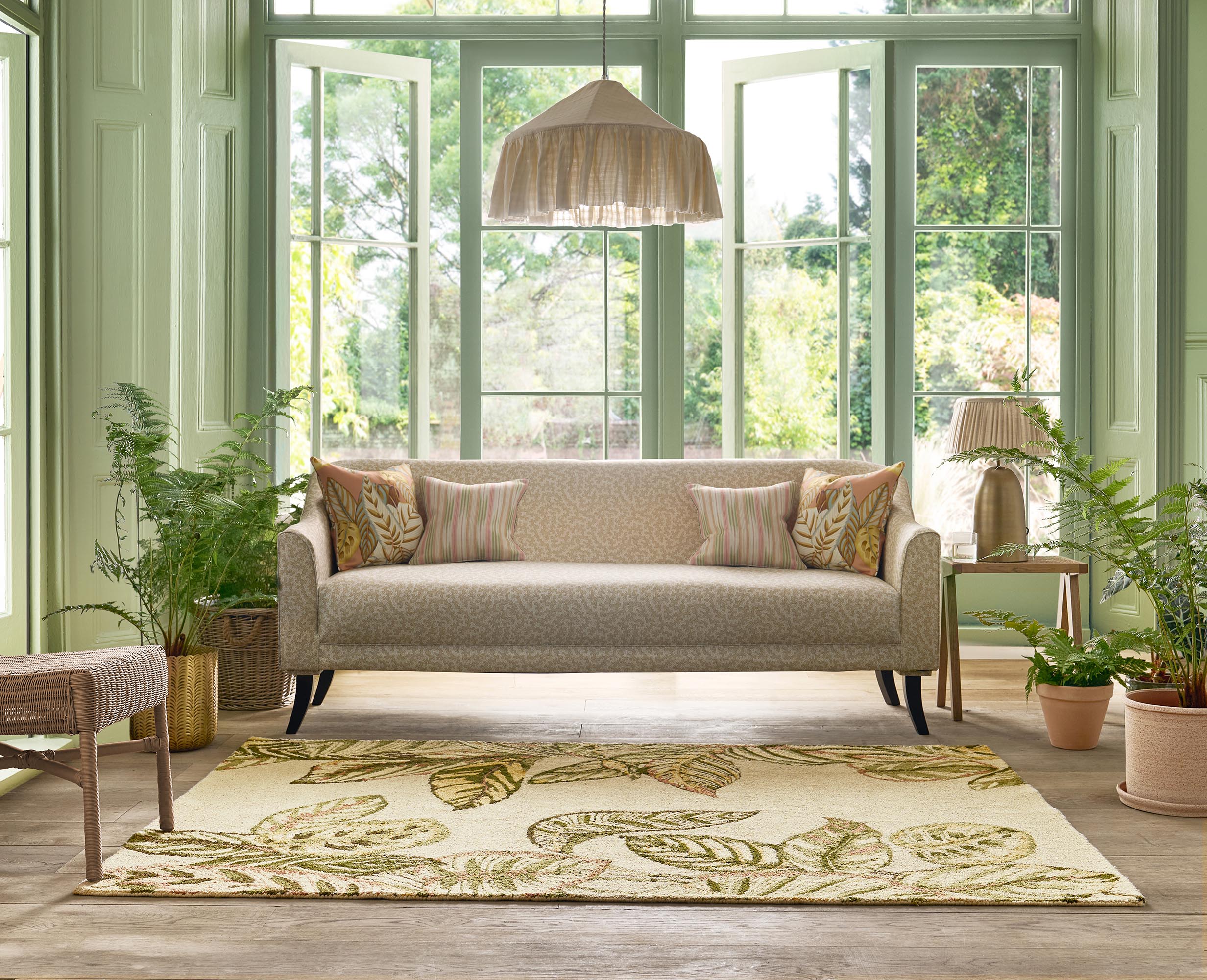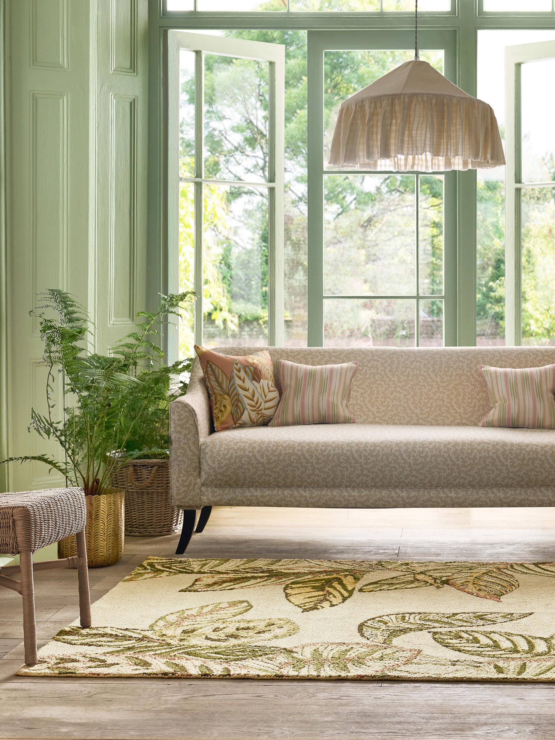 The Sanderson Calathea Samphire 445617 brings lush tropical elegance to your outdoor and indoor spaces. Made from 100% recycled PET yarns, this handtufted rug features a vibrant leaf pattern in greens, ivories, and soft pinks, combining eco-friendly durability with stylish design.