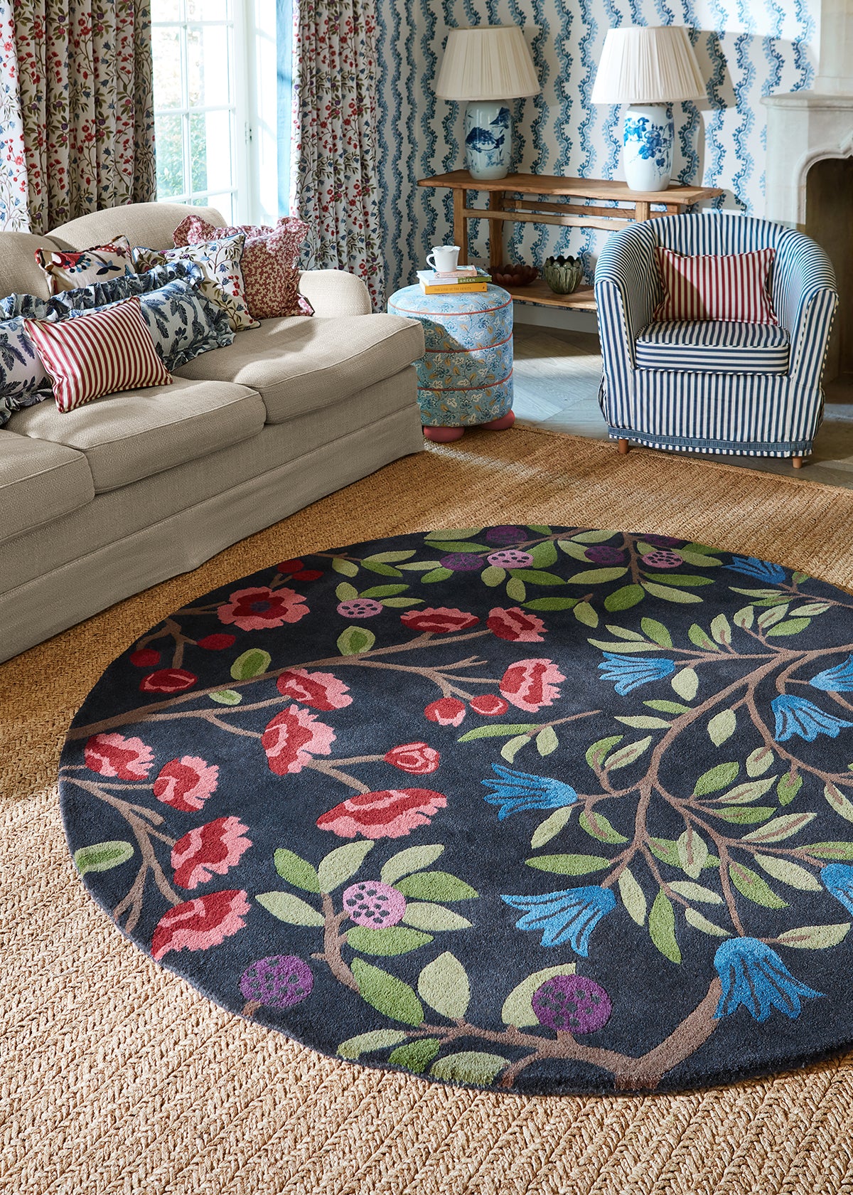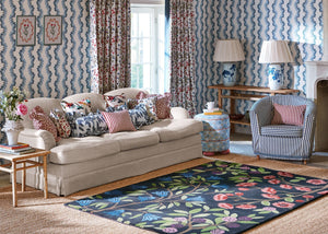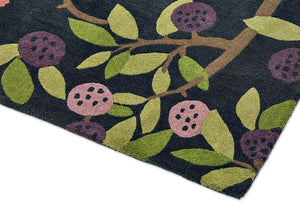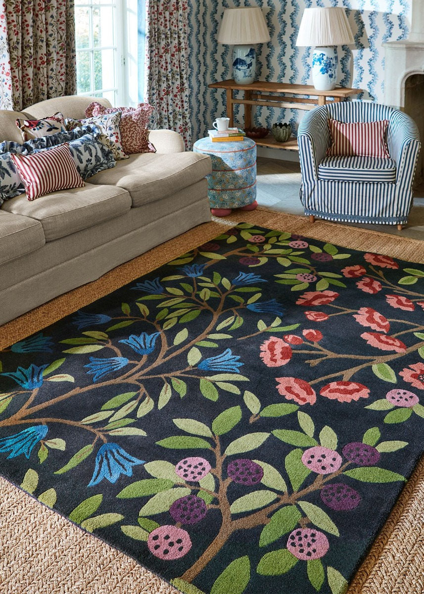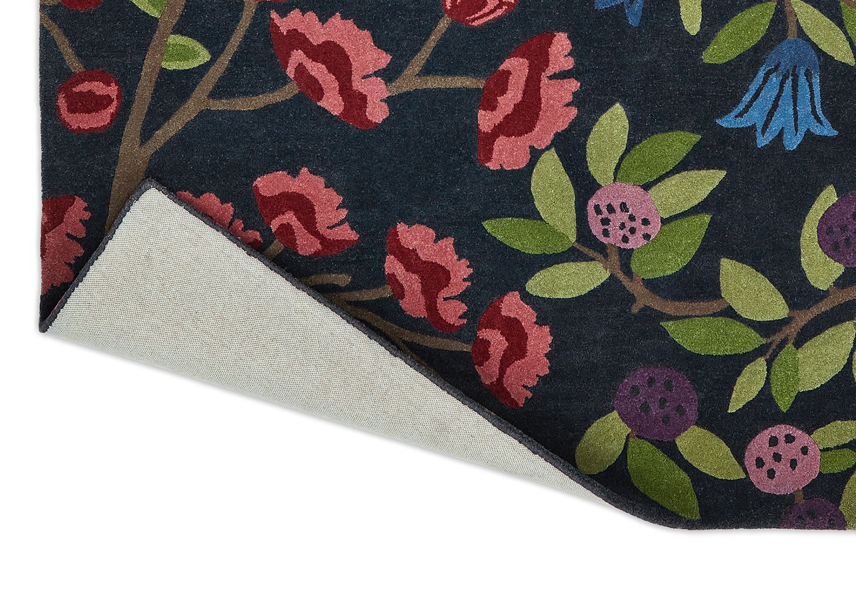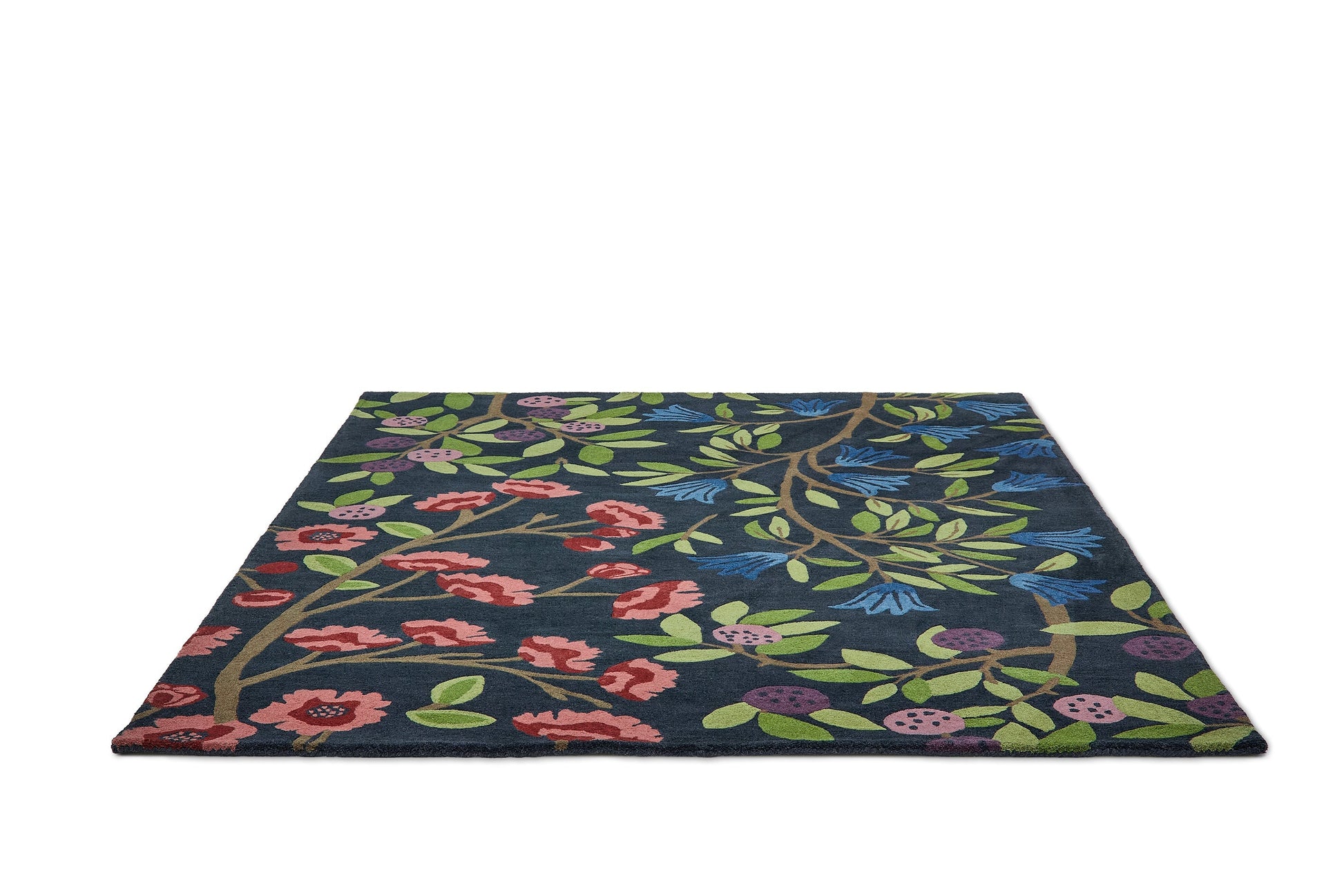 The Sanderson Foraging Indigo 146618 rug features a rich indigo background adorned with intricate blooms of wild berries, sloes, and blossoms, capturing the essence of a woodland-inspired design. Handtufted from 100% pure new wool, this rug offers a plush 17mm pile, providing both comfort and durability, making it an ideal addition to living rooms, bedrooms, or study areas.