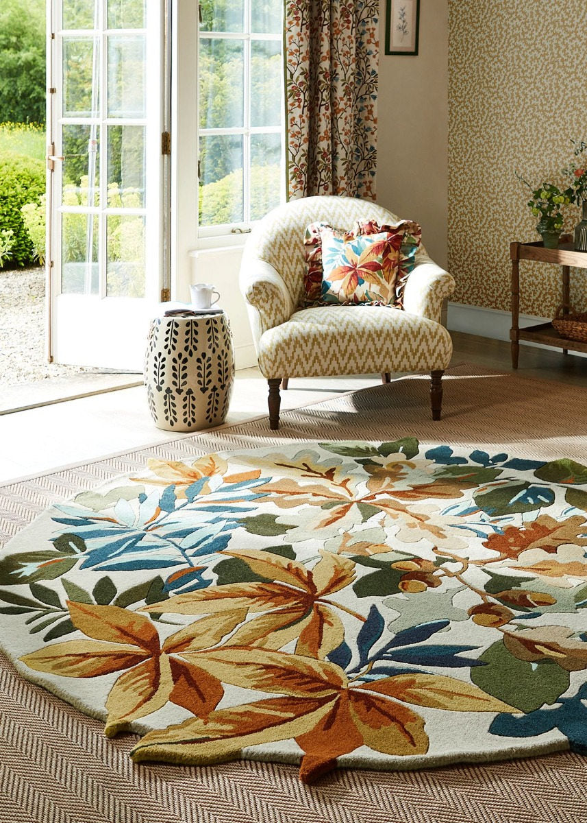 The Sanderson Robin’s Wood Russet Brown 146501 features a soft ivory background adorned with natural-toned floral motifs in warm russet, ochre, and earthy hues. This handtufted wool rug boasts a unique contoured shape following the floral outlines, adding an elegant, organic feel to your living room, bedroom, or study.