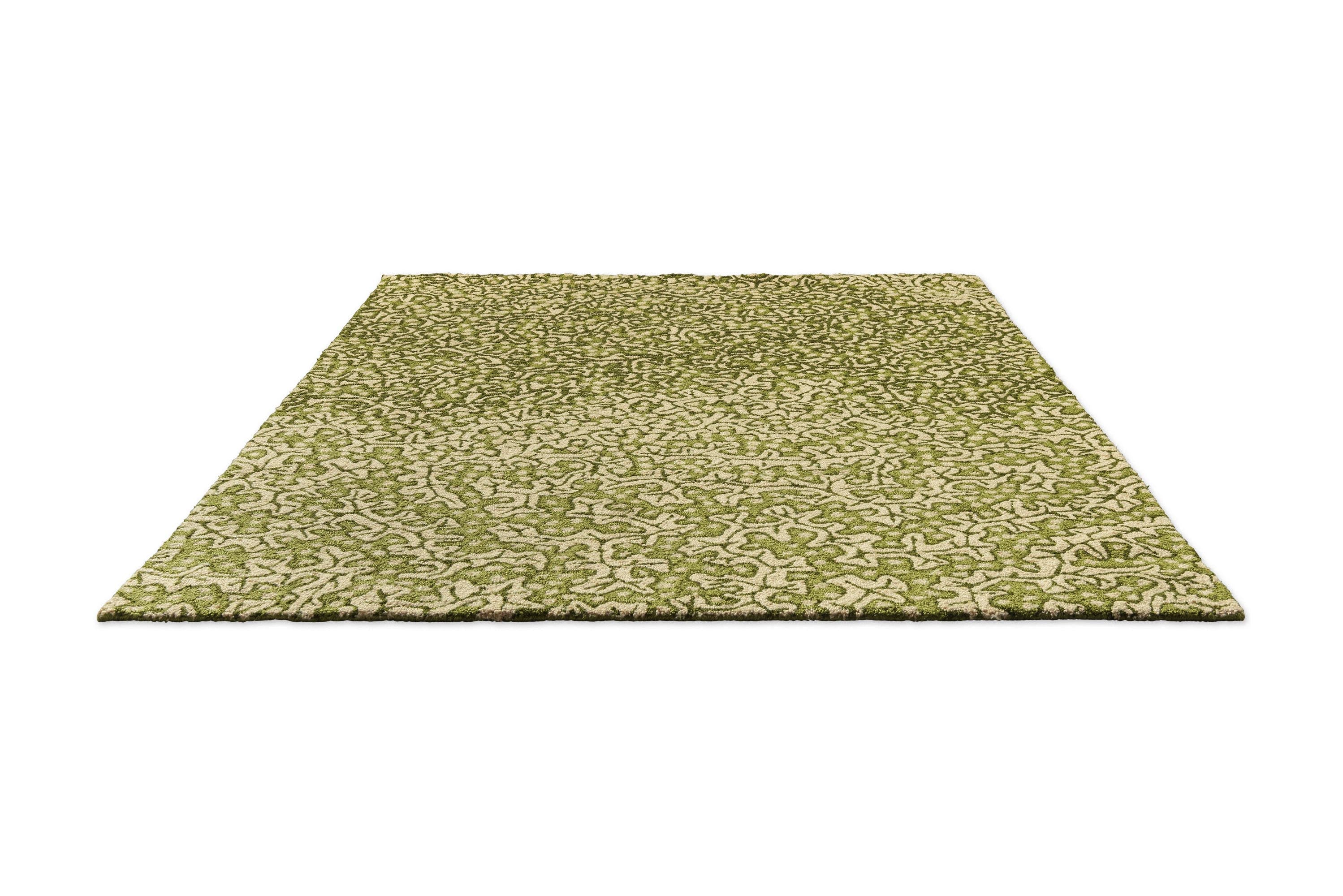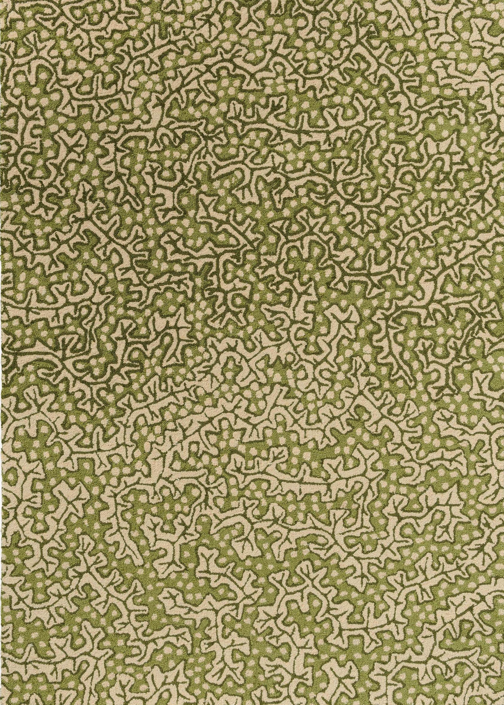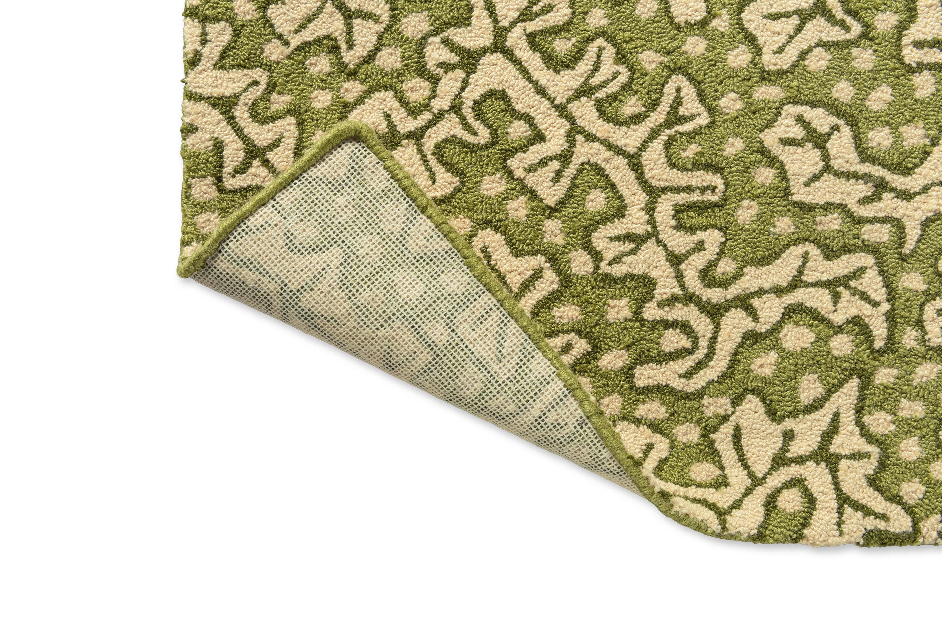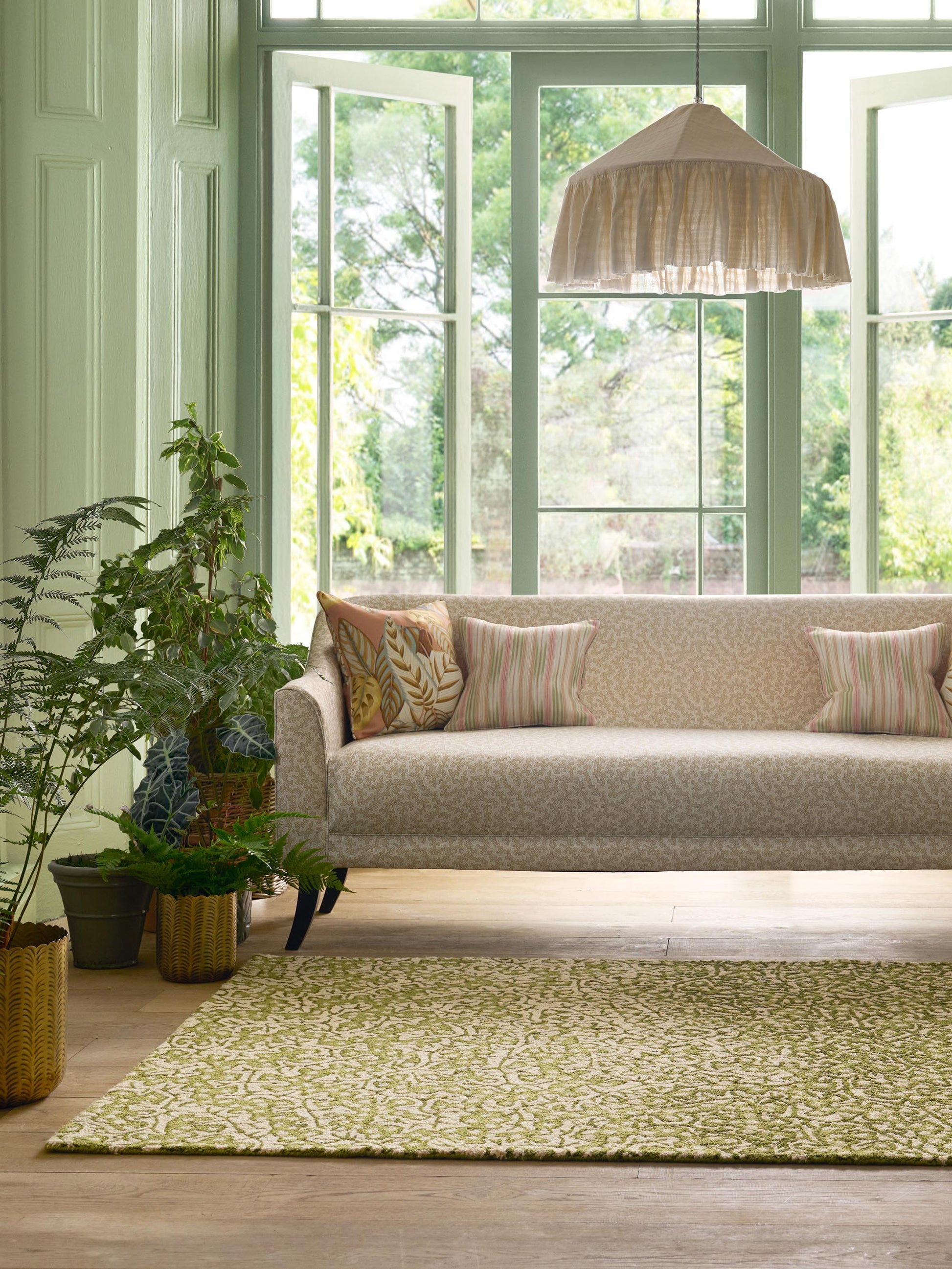 The Sanderson Truffle Olive 446007 outdoor rug features a calming olive green base with soft abstract patterns inspired by natural textures. Made from 100% recycled PET fibers, this hand-tufted rug combines weather-resistant durability with a plush 6mm pile, perfect for patios, balconies, or garden rooms seeking a refined yet resilient flooring solution.