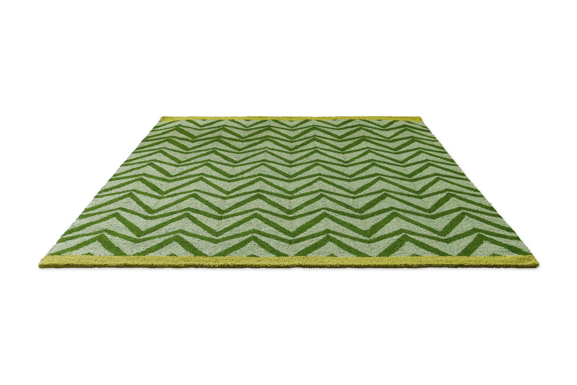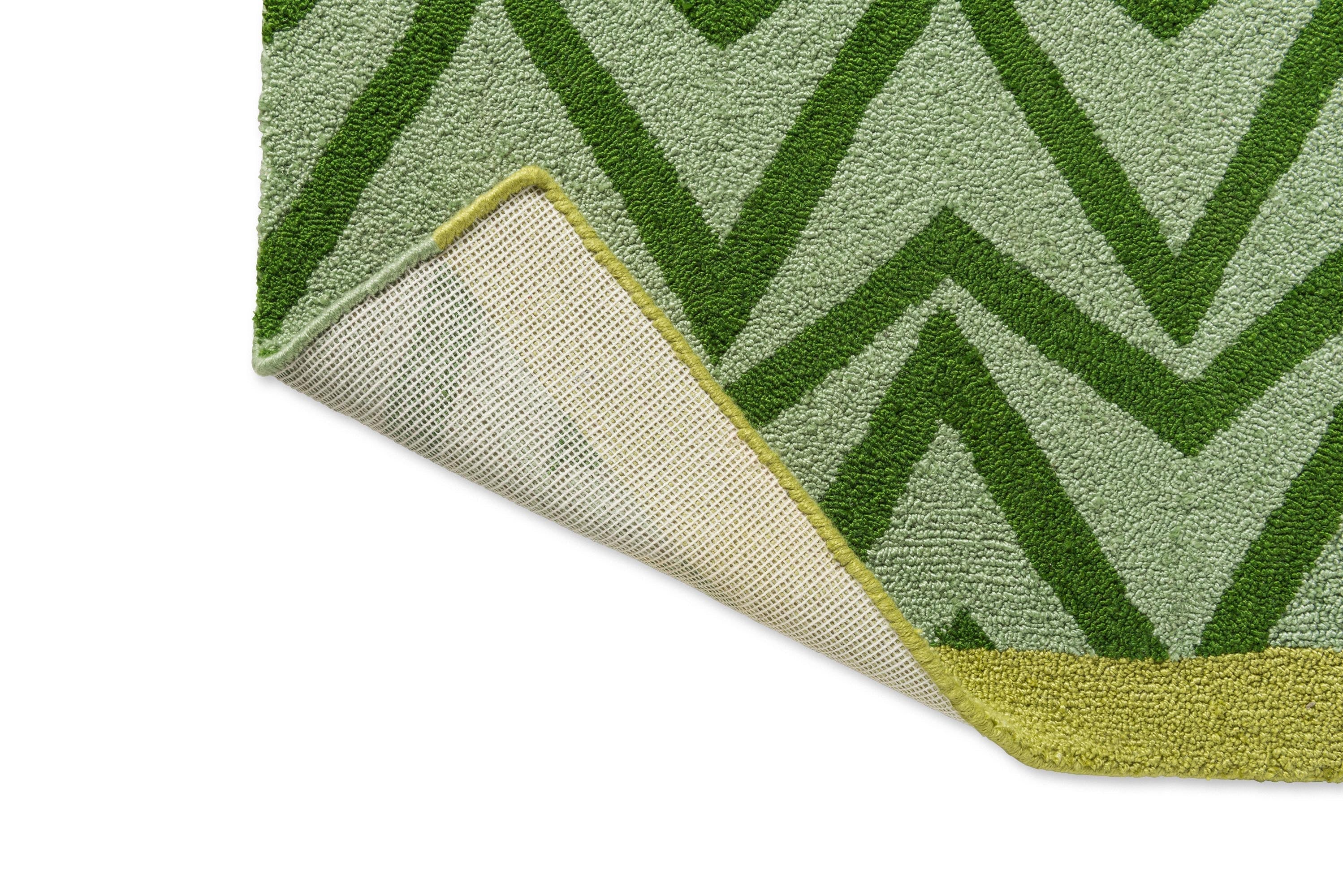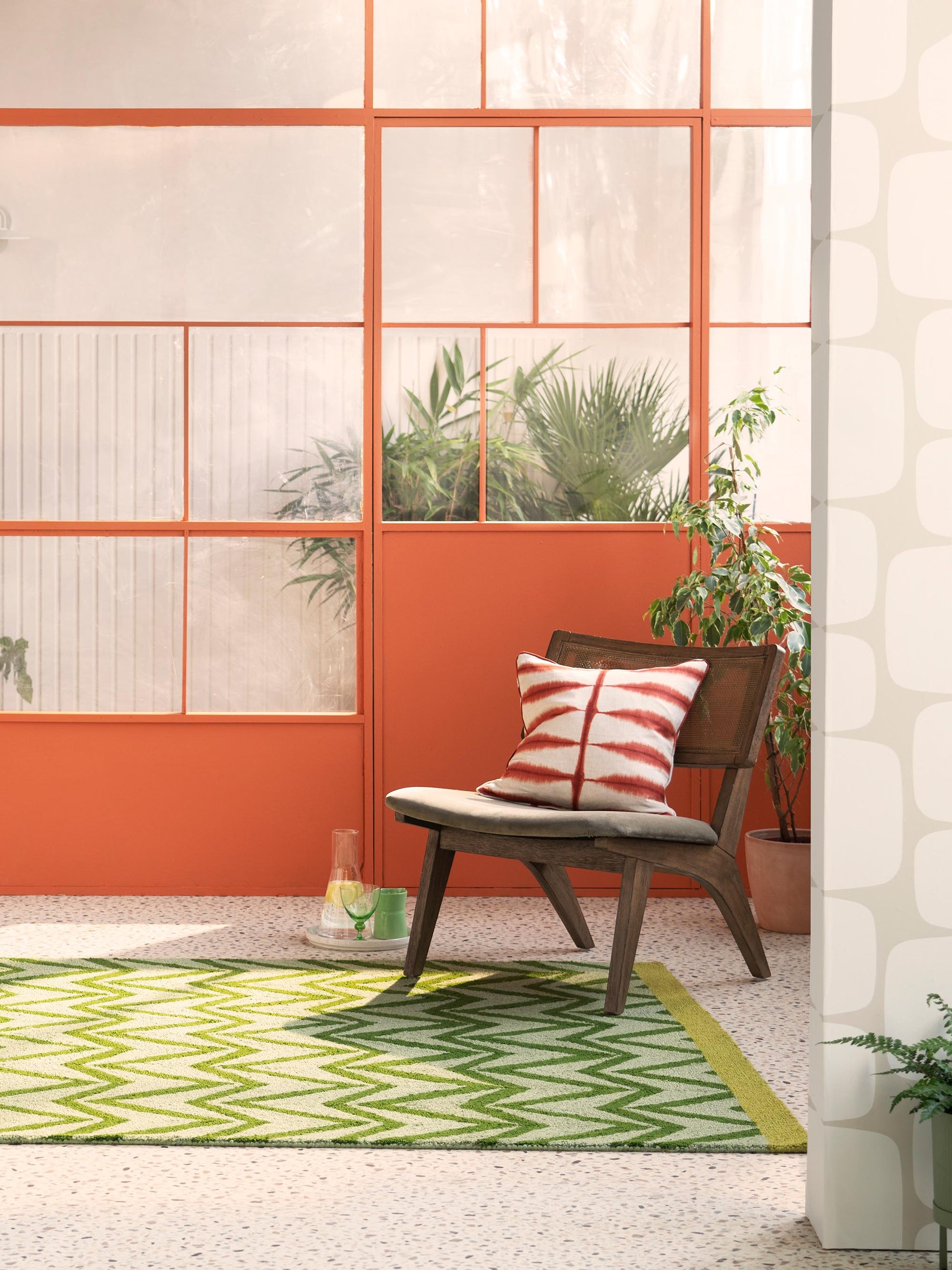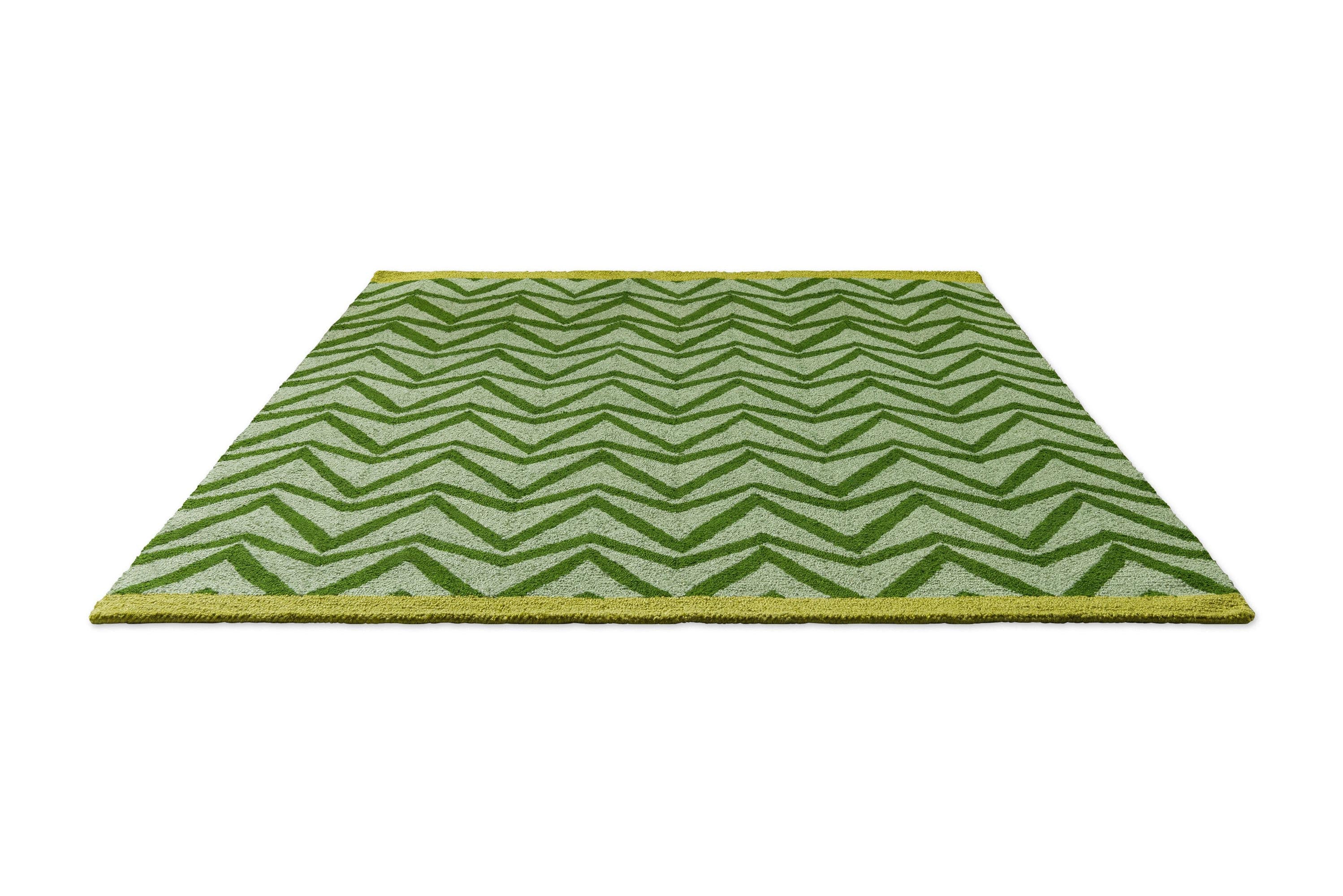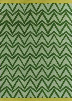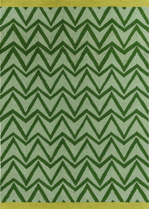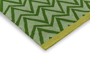 The Scion Dhurrie Green 426307 outdoor rug features a striking chevron design in vibrant green tones framed by a warm mustard border. Made from 100% recycled PET fibers with an 11mm pile, it offers both durability and style, perfect for patios, balconies, or sunrooms.