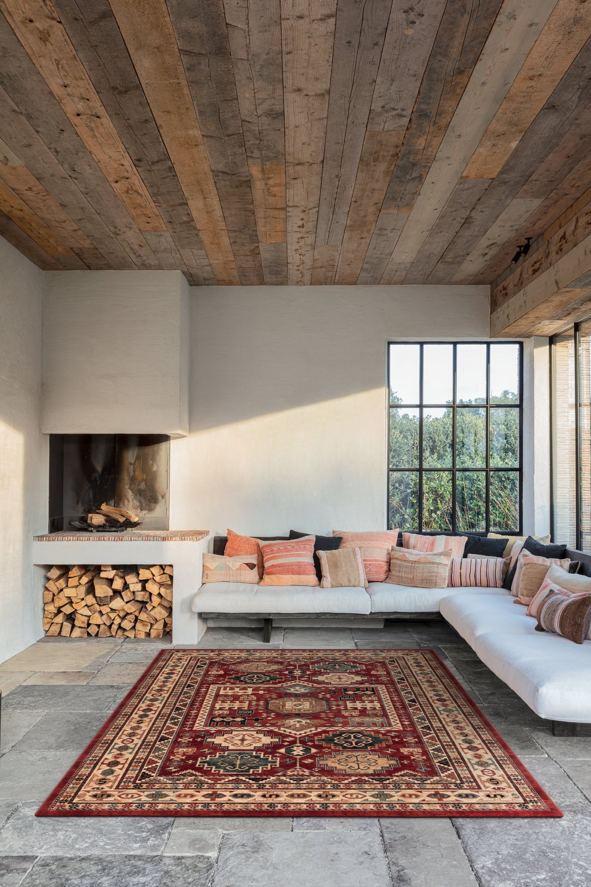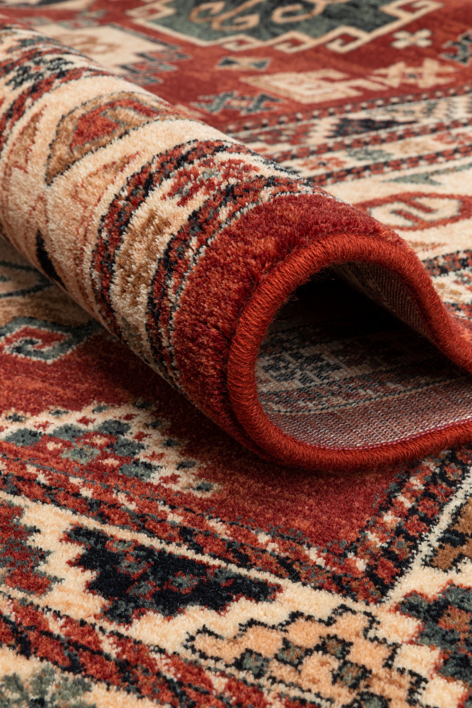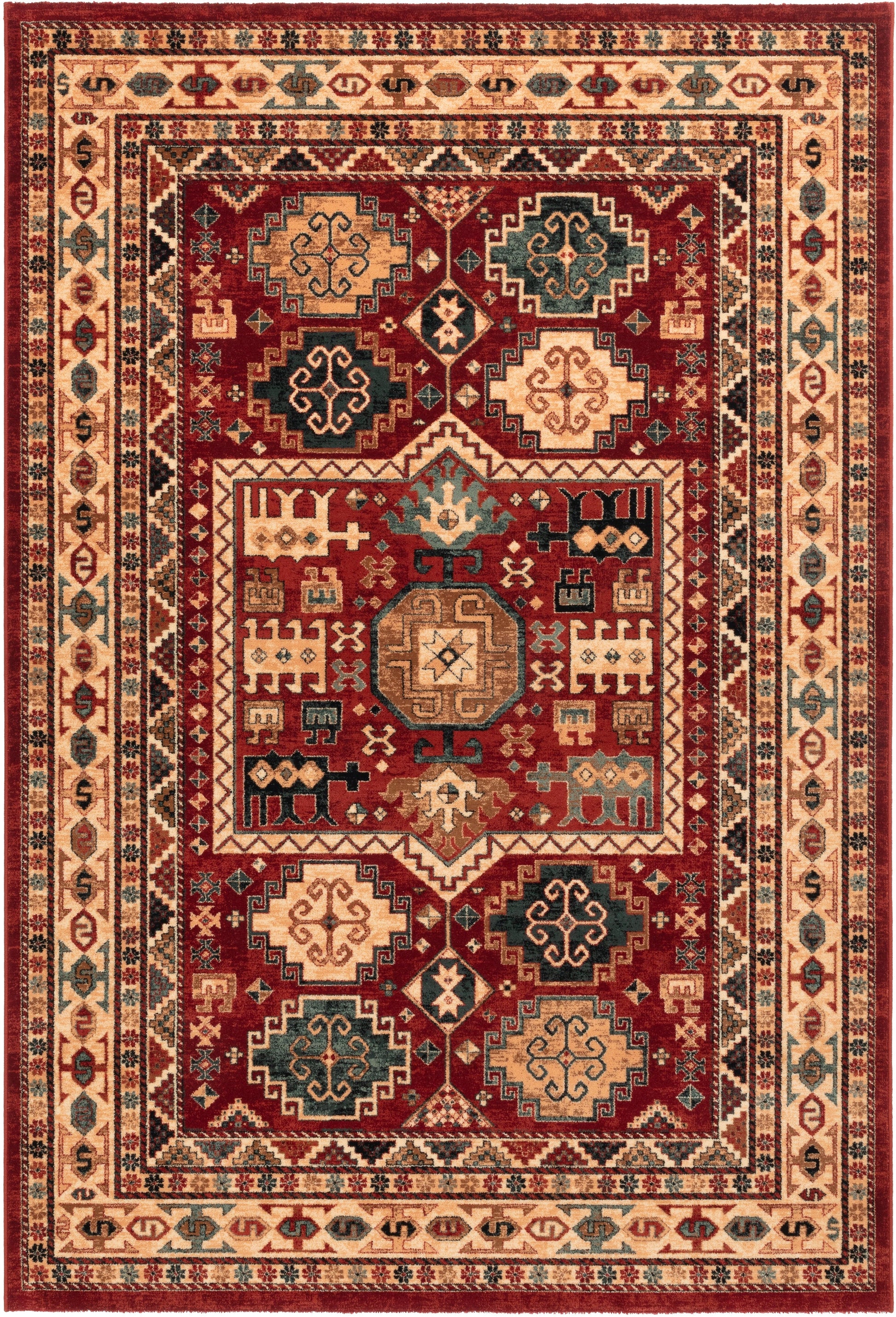 The Kazak Kashqai 4306.300 combines a bold red background with refined beige motifs, creating an ethnic design full of contrast and character. Rooted in Oriental inspiration, it carries the essence of traditional craftsmanship while offering a look that adapts seamlessly to both classic and modern interiors.