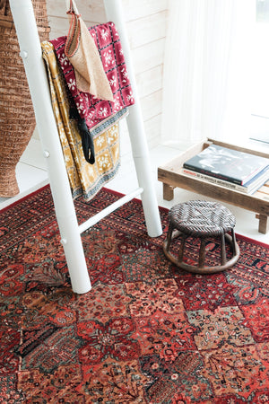 The red tones create an inviting atmosphere that pairs beautifully with rustic wood, vintage décor, or leather accents. In contemporary interiors, it provides a striking focal point, energising neutral or minimalist settings with warmth and depth. Ideal for living rooms, dining spaces, or even a bedroom where a rich, ethnic accent elevates the mood.