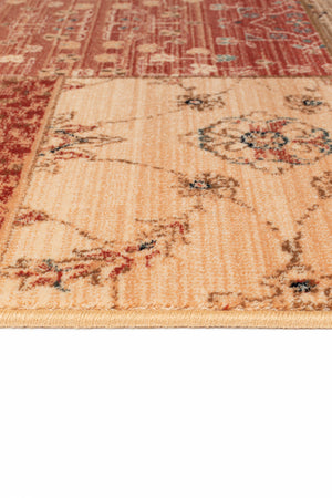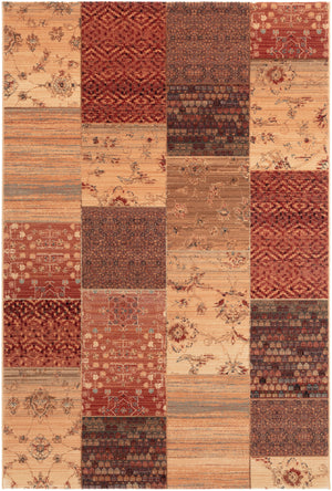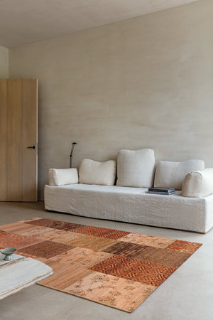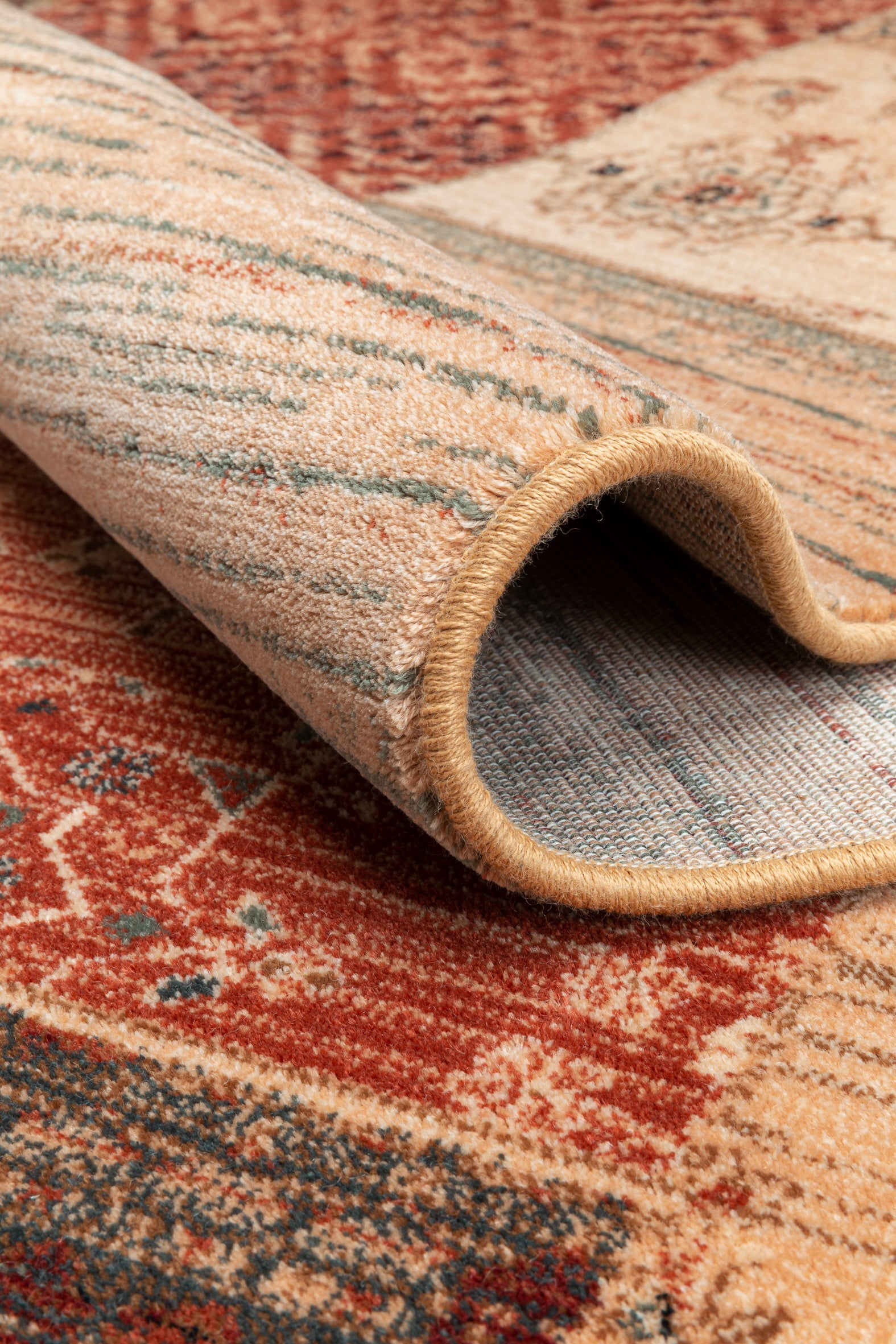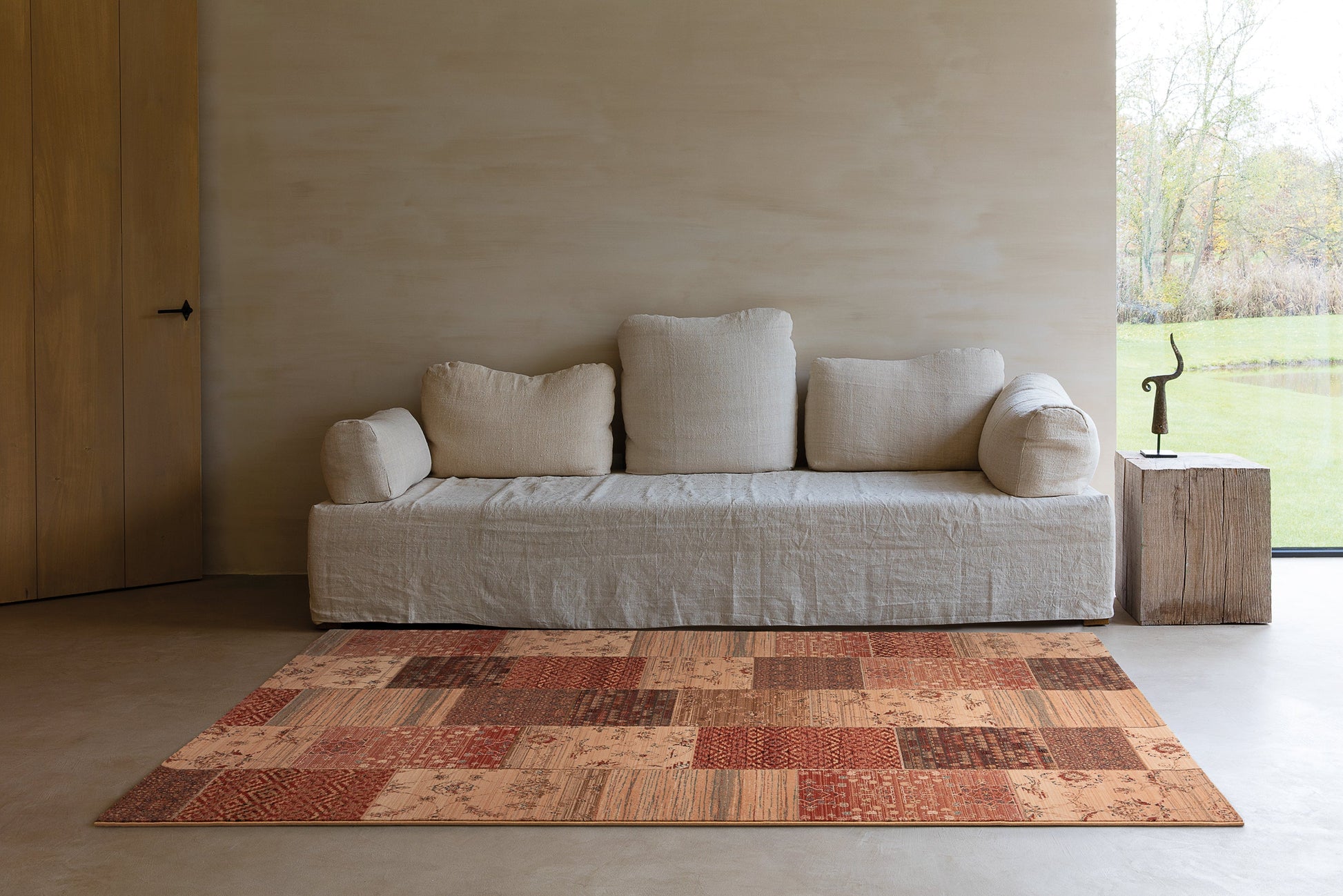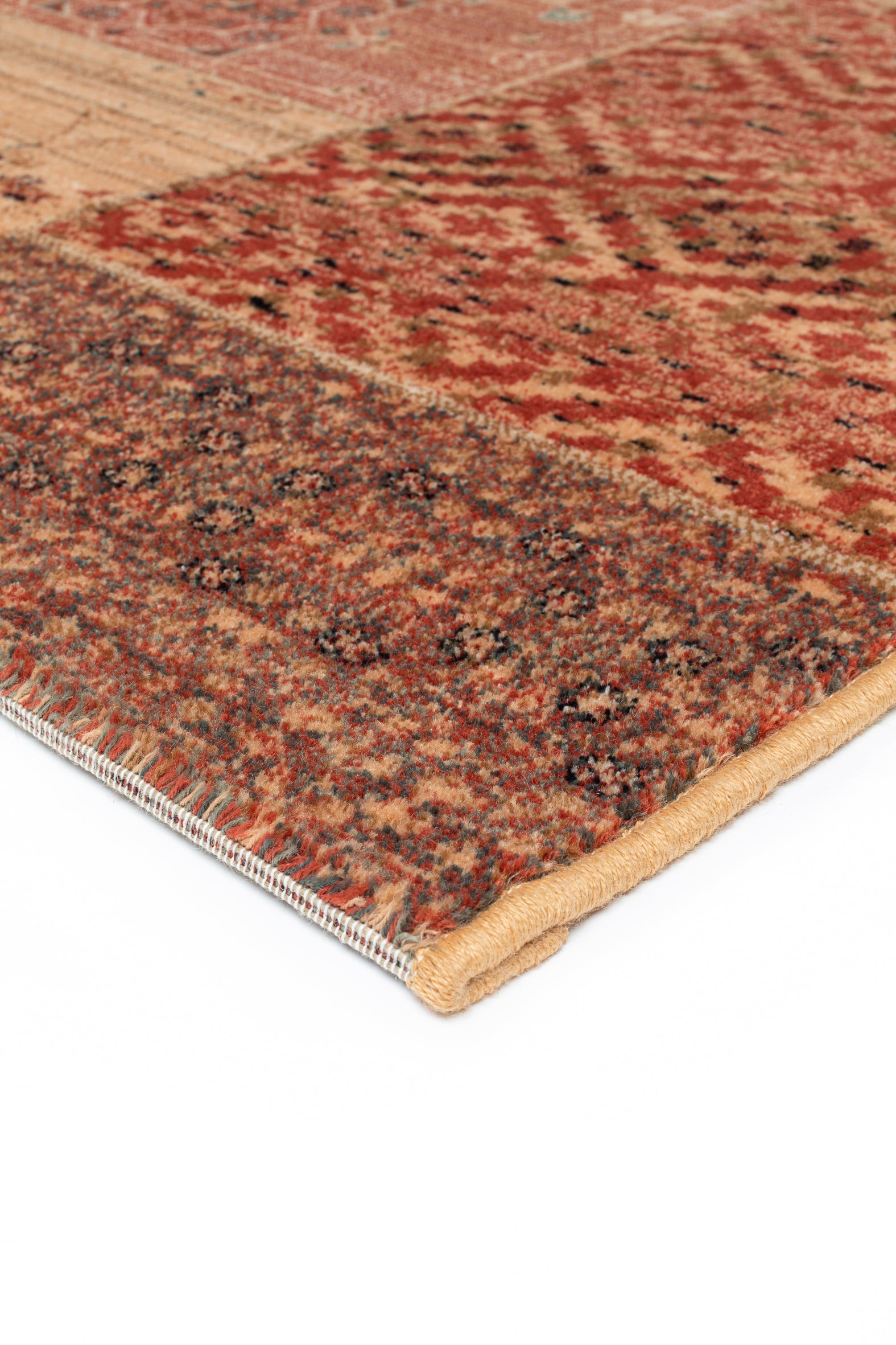 The Timeless Creativity Kazak Kashqai 4327.101 stands out with its artistic patchwork design in glowing red, rust, and orange hues. Each block feels like a fragment of tradition, woven together into a rich composition that adds both energy and warmth to your home.