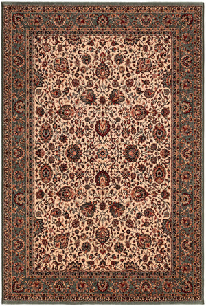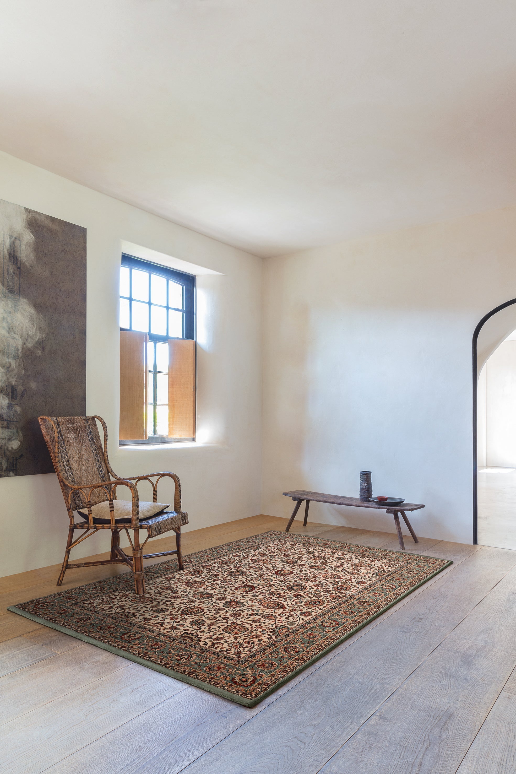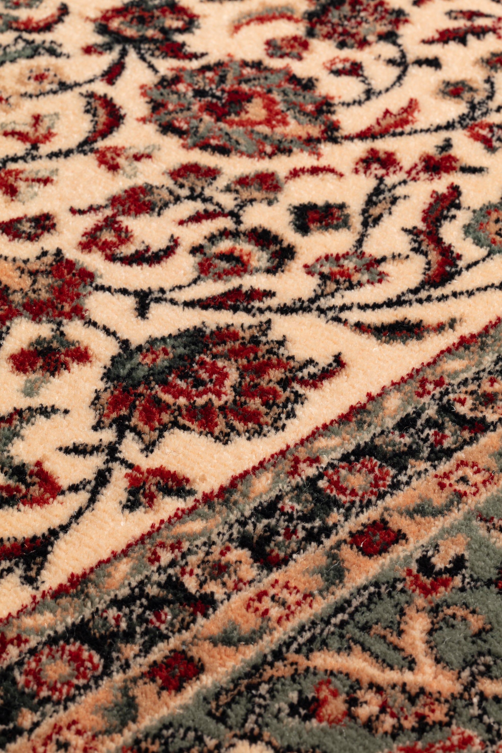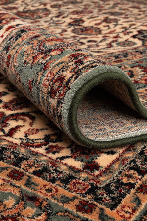 Its neutral beige base makes the rug versatile, blending easily with both light and dark furniture. The green border adds structure and definition, making it a natural fit for dining rooms, elegant living spaces, or even a bedroom where calm and character meet. Pair it with wooden or upholstered furniture to highlight its refined charm.