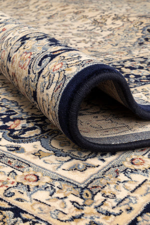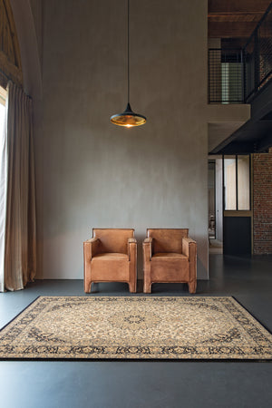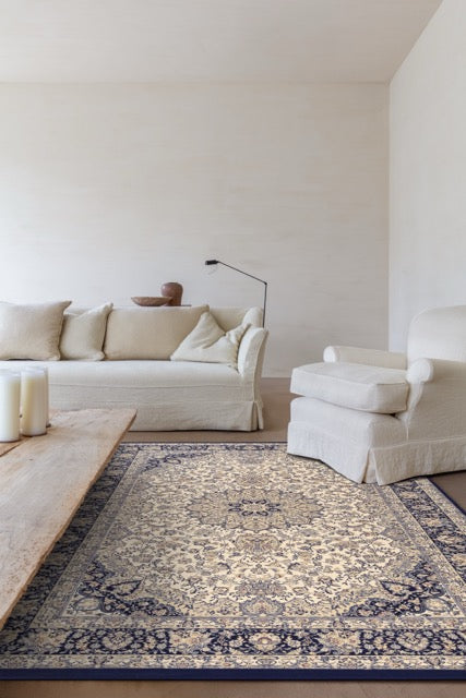 The Royal Classic Diamond 7252.100 combines a soft beige base with a striking blue medallion and a matching border. This balanced contrast creates a refined, timeless aesthetic that brings together classic Oriental inspiration with Belgian craftsmanship.